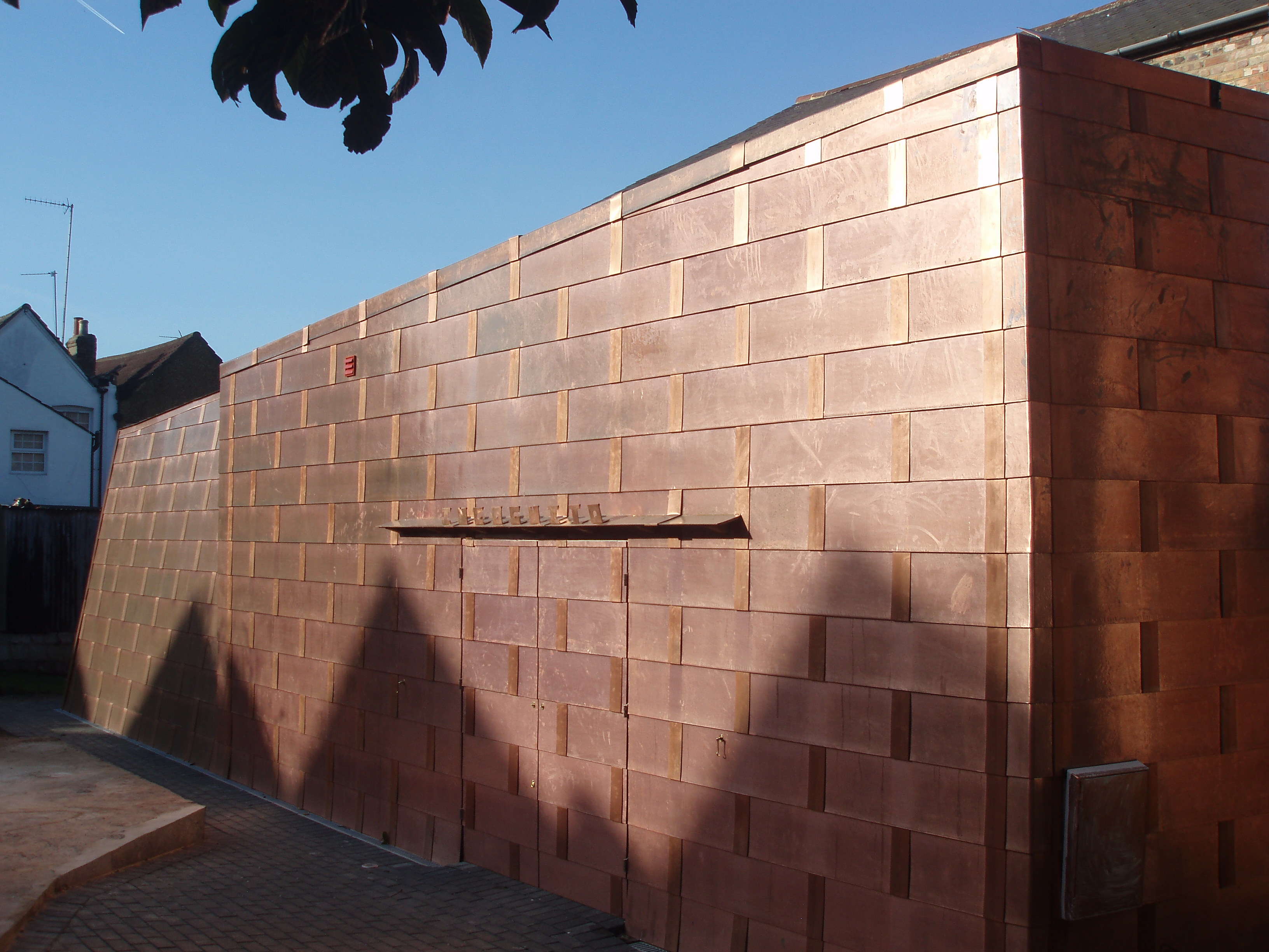The structure is a thin timber frame strutted externally to the workshop and internally to the foyer, plywood sheathed and copper tile clad.