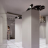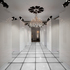 The spaces between columns allow views across the three zones and through to the walls of the Orchid Suite beyond. The audience experience the show as a series of fragments when looking across space, four spaces collapsed into one view, continuously shifting and changing as the viewer moves. In contrast, the central corridor offers a single view, reinforced by perspectival columns, a space with a single focus. The walls are formed in a seamless white surface, reflecting the materials of the room and animating the pattern of the Teatum Jones collection.