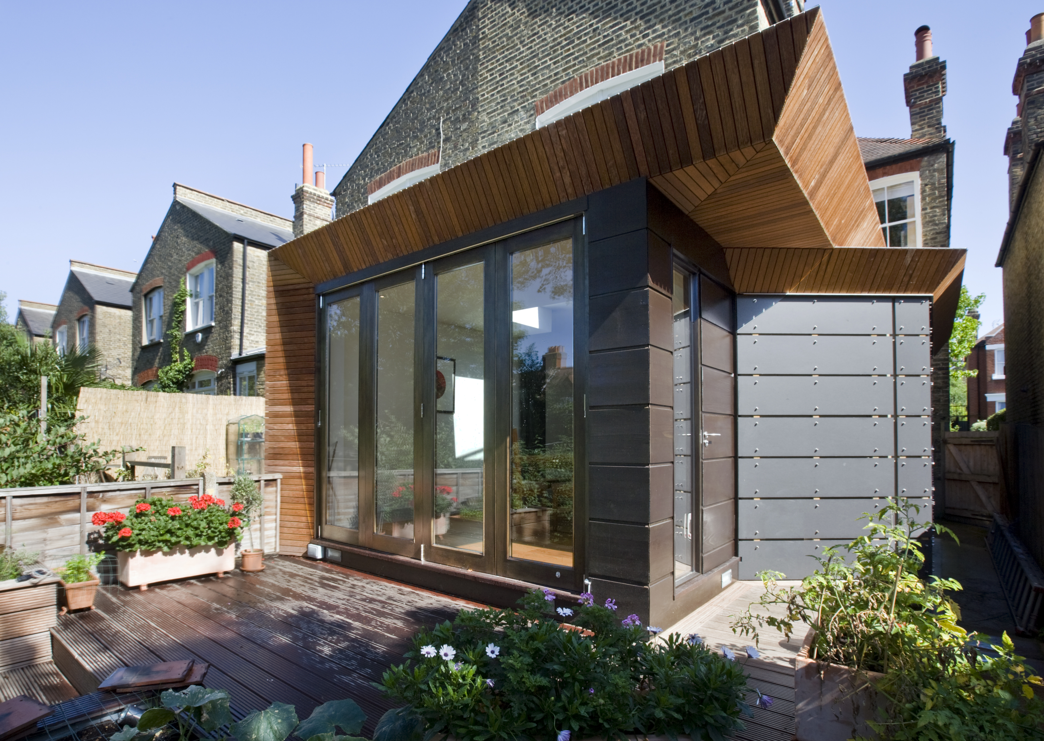 To the rear a new extension was built to form a dining area, lit from above with a large skylight. The extension is clad in Ipé and wide cedar boards, continuing on to the surrounding raised garden decking to create uniformity.