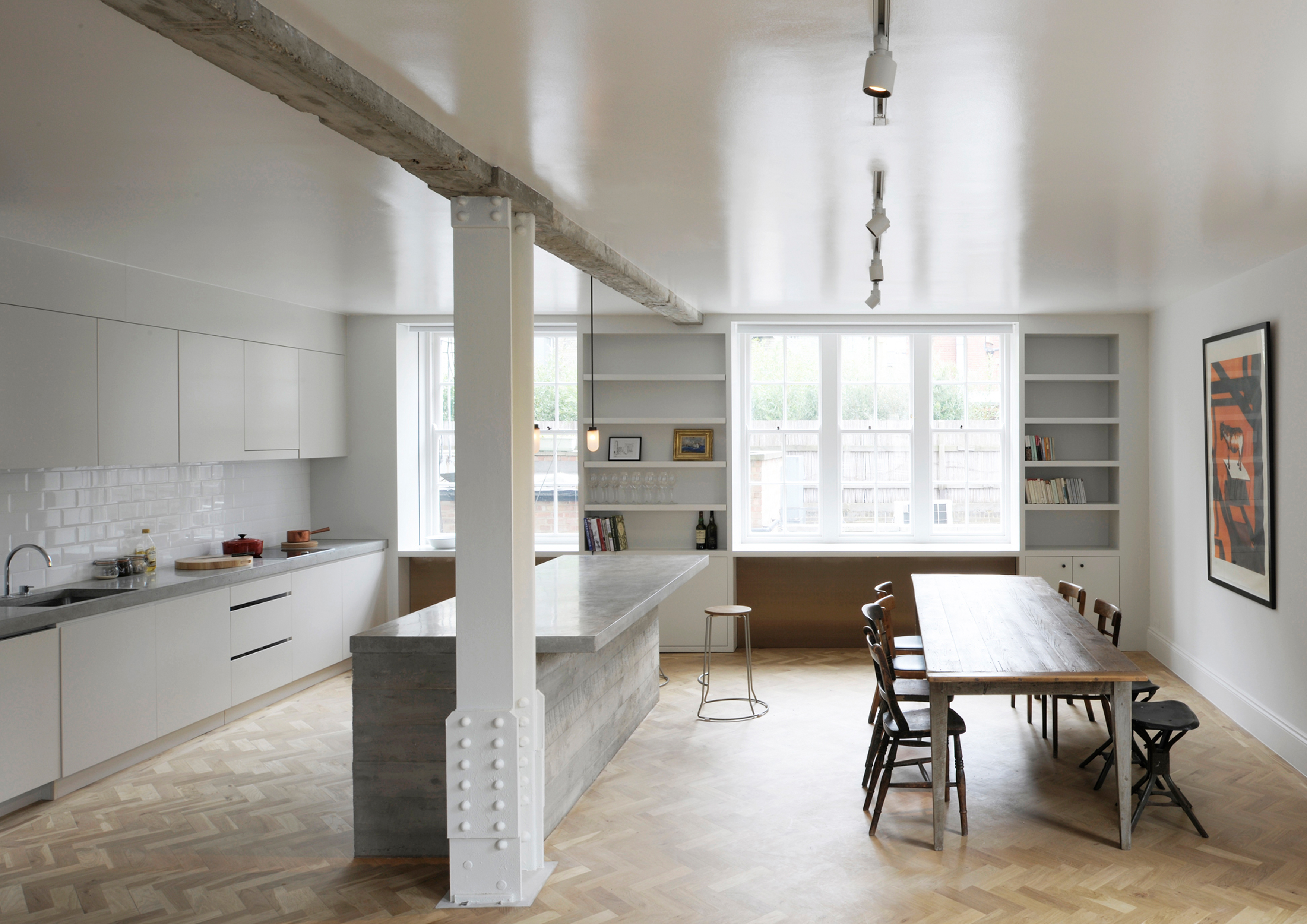 This two-bedroom apartment in central London was found in a state of faded grandeur, having been left unoccupied for years. Inspired by the qualities of the original space, we developed a design approach that would adopt a simple but rich material palette that made reference to the latent quality of the 1930s interior. Original architectural features including steel columns and concrete beams were left exposed and sash windows restored.