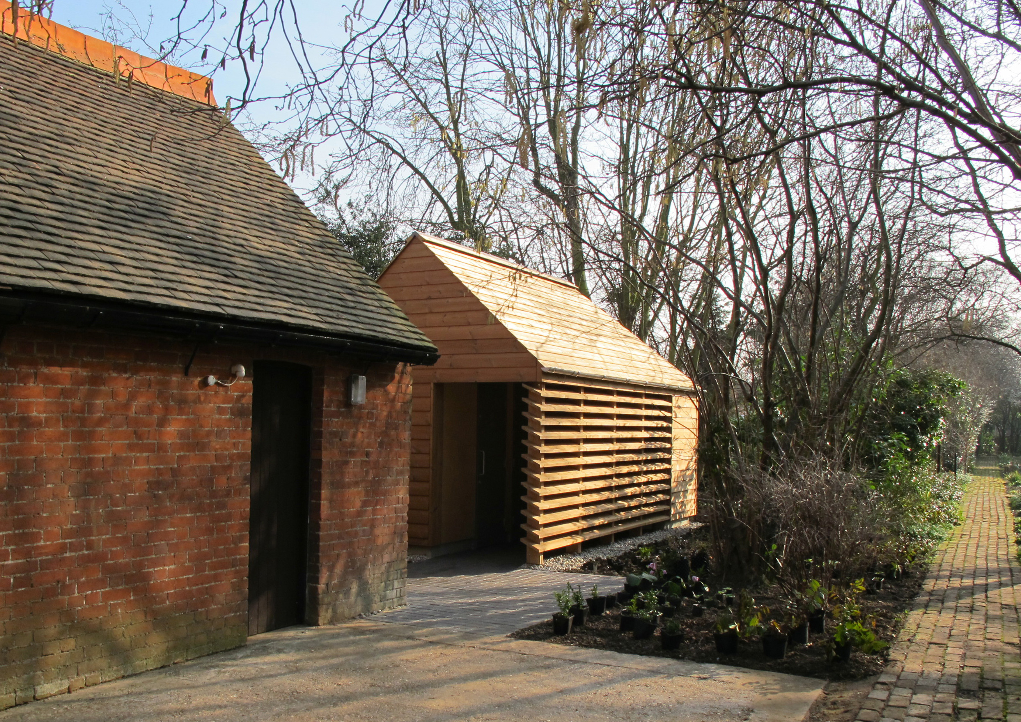The roof form of the pavilion echoes and mirrors that of Webb’s steeply pitched, hipped and gabled Stable building nearby, albeit clad in timber and clearly reading as a contemporary addition. It effectively forms a new ‘book-end’ to the adjacent Coach House, completing the composition, and making a new relationship between the three outbuildings.