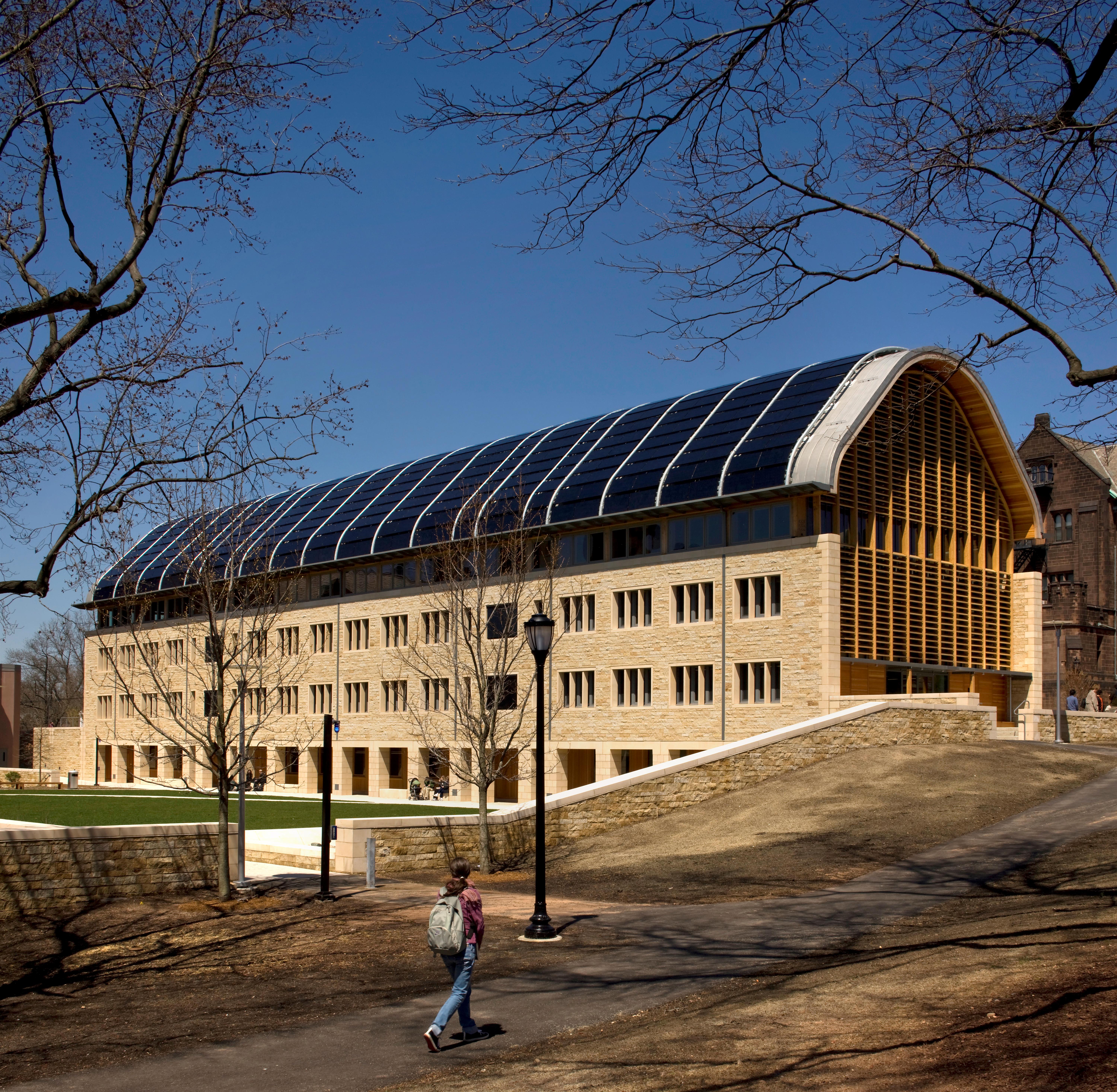 Traditional stone was specified for the lower three storeys in reference to the neighboring collegiate buildings, with a contemporary structure of glulam beams forming the upper triple-height spaces. Photovoltaic panels clad the southern face of the roof structure, minimizing the building’s energy requirements.