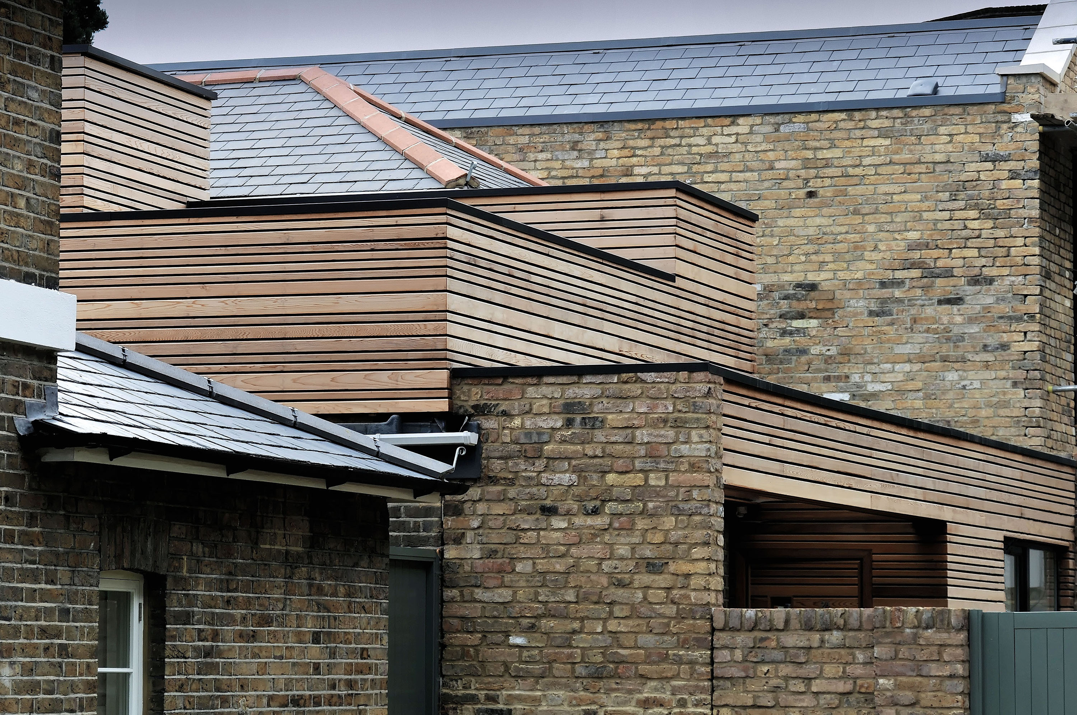 Remodelling the front of the cottage, resulted in a ‘back-to-front’ extension that is crisp, confident and adds a new warm focal point to the existing house, with its interplay of shifting and projecting volumes clad in Western Red Cedar timber rain-screen of varying strip widths.