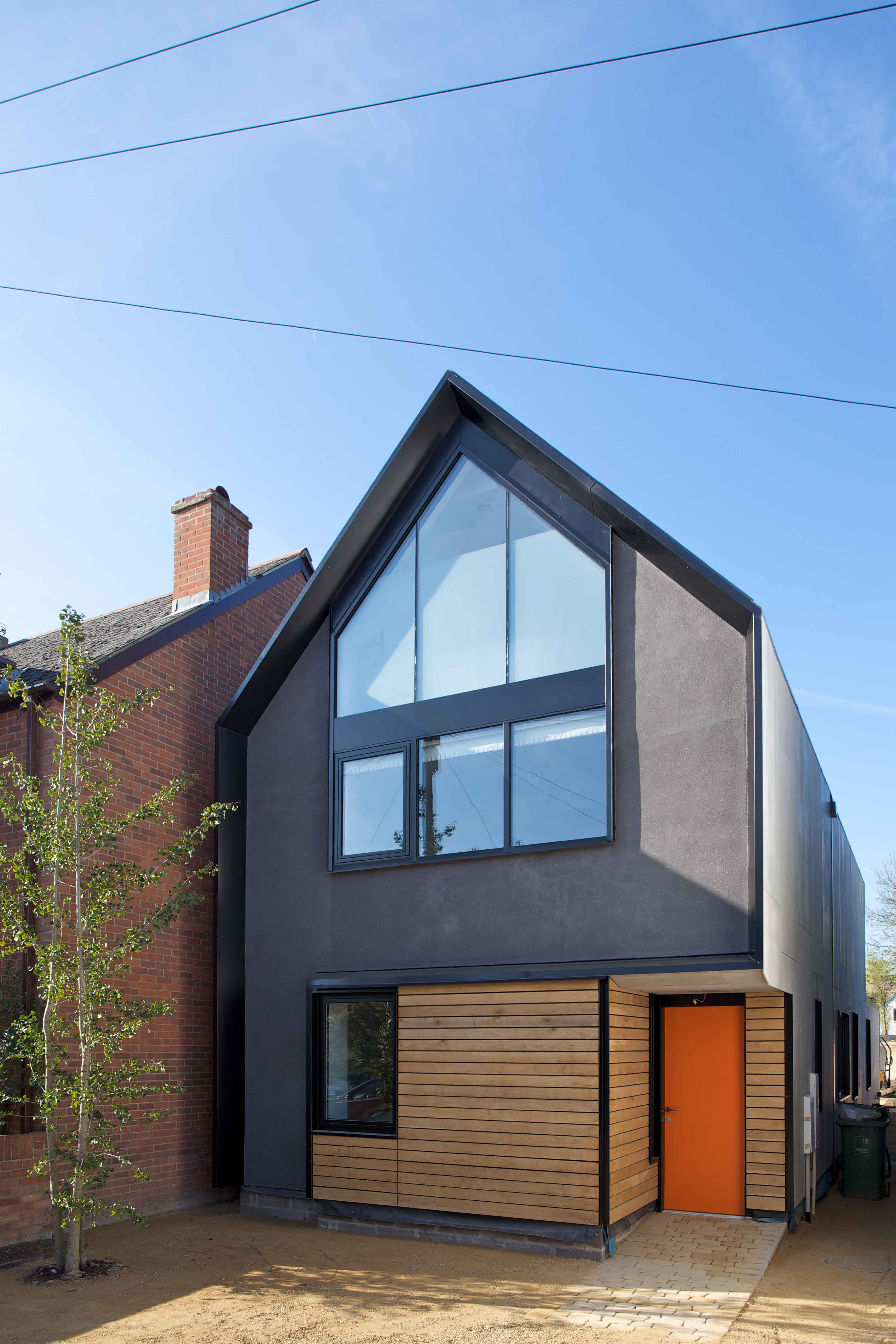 Surface materials comprise a mixture of modern and traditional, including rough sawn oak cladding, machined oak cladding and cement particle board.
