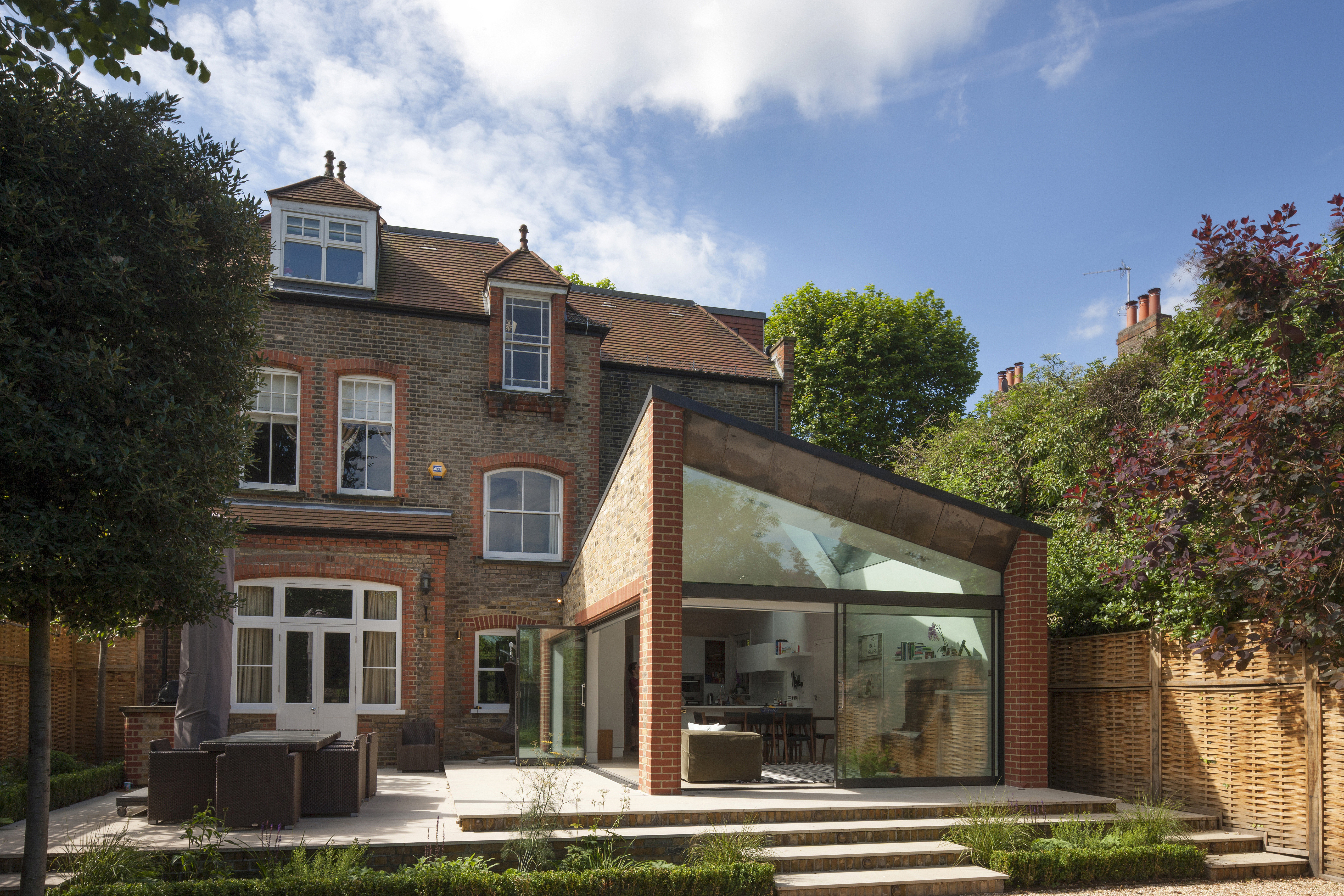 The form of the extension takes reference from the pitched roofs of the existing house to create a unique internal space ‘opening-out’ towards the garden to maximise natural light and connectivity with the landscaped garden, whilst reducing overlooking from a neighbouring apartment block.