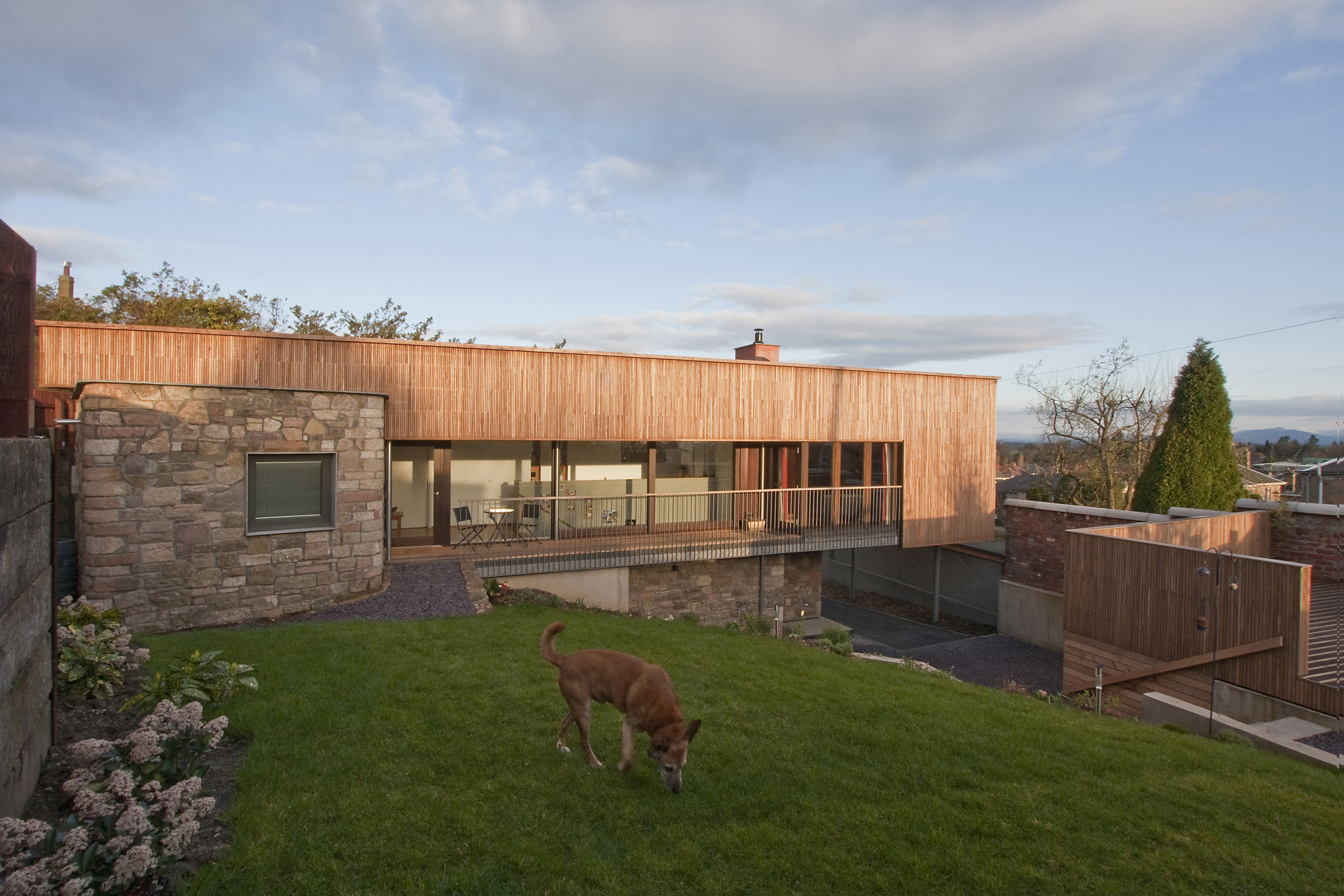 The house's Iroko-clad structure rests on a single-storey stone plinth nestling behind the trees and walls that currently characterise the Drossie Road side of the site. A pebbled roofscape presents a ‘fifth elevation’ and offers presentable views from neighbouring houses.