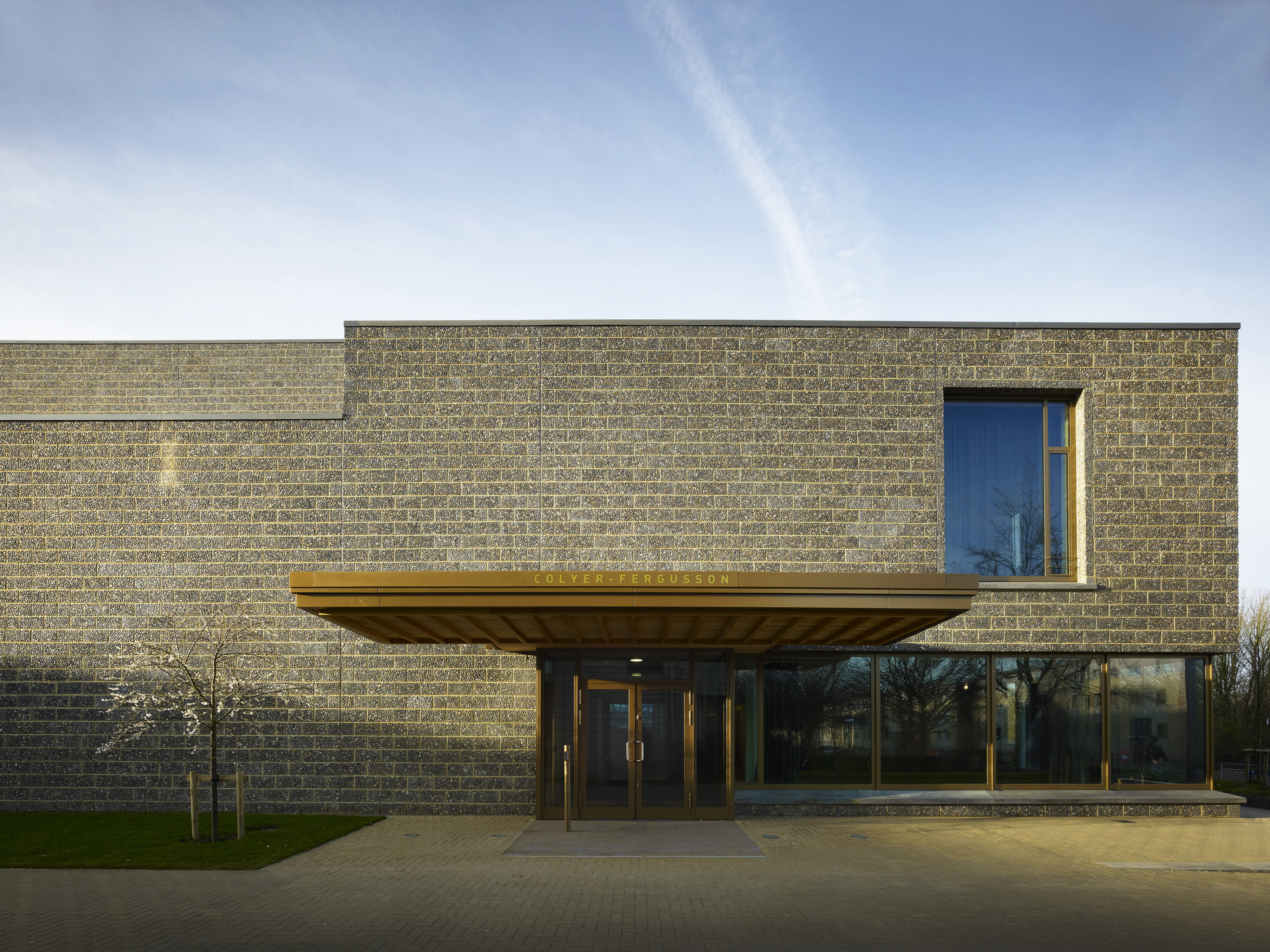 The exterior of the building is clad with bespoke blocks faced with pebble and flint due to demands of Canterbury's planners. The steel structure is hidden behind finishes with the services and acoustic performance regulators concealed within the voids in the construction.