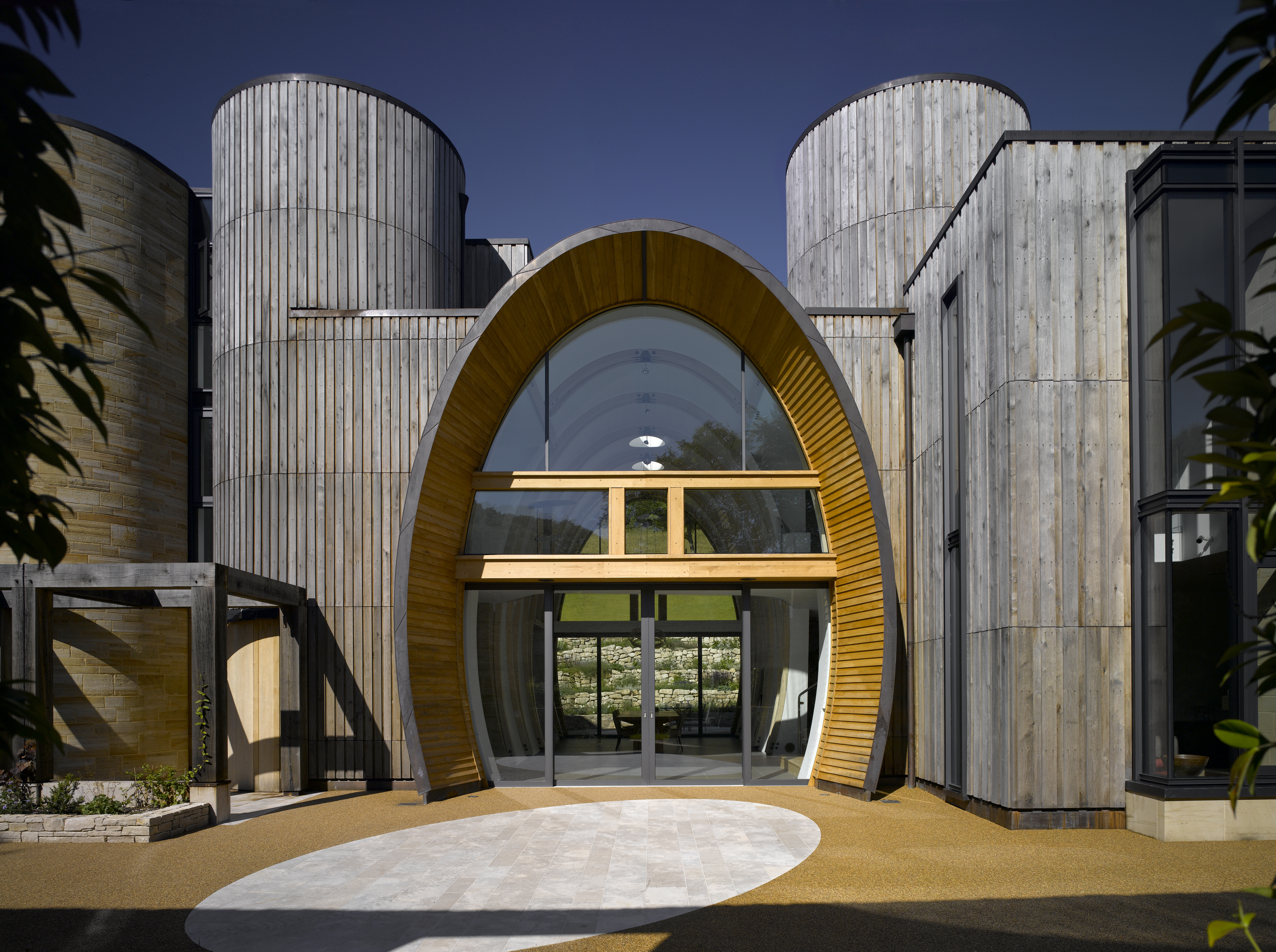 The wings are constructed of cross-laminated timber (CLT) panels and the barrel vault is made of a CLT timber shell and glue lam ribs. This low-embodied energy of the construction and the efficient envelope combined with a ground source heat pump and heat recovery system aims to create an energy efficient building.