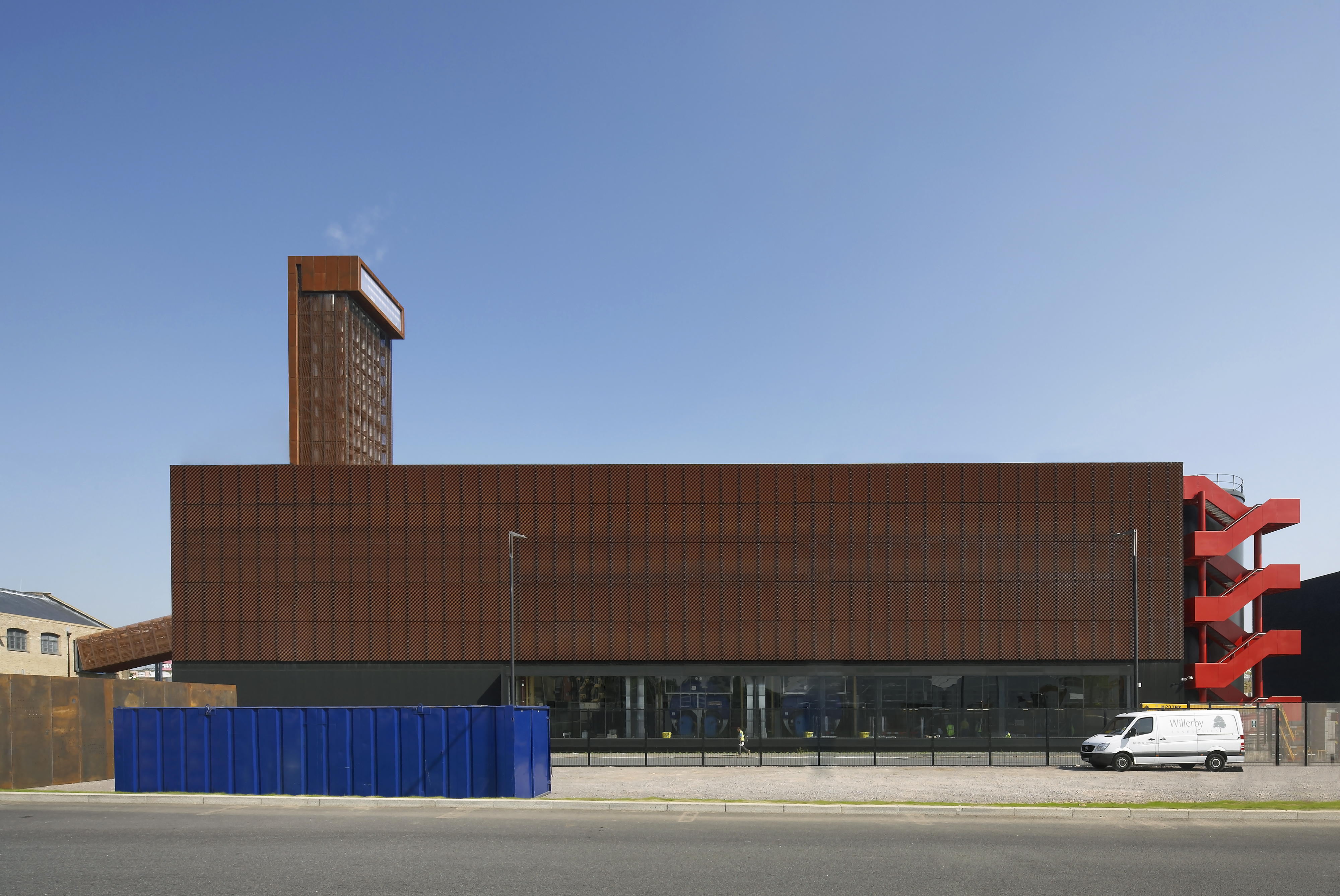 The 18m-high rectangular box is constructed with a modular steel structure where panels on the principal facades can be removed to provide access for plant. A surface layer of Cor-ten mesh to screen louvre and fenestration adaptations in the underlying weathering envelope, creates a flush, uniform, monolithic appearance. A 45m tall screened tower acts as the ventilation flue for the power station.