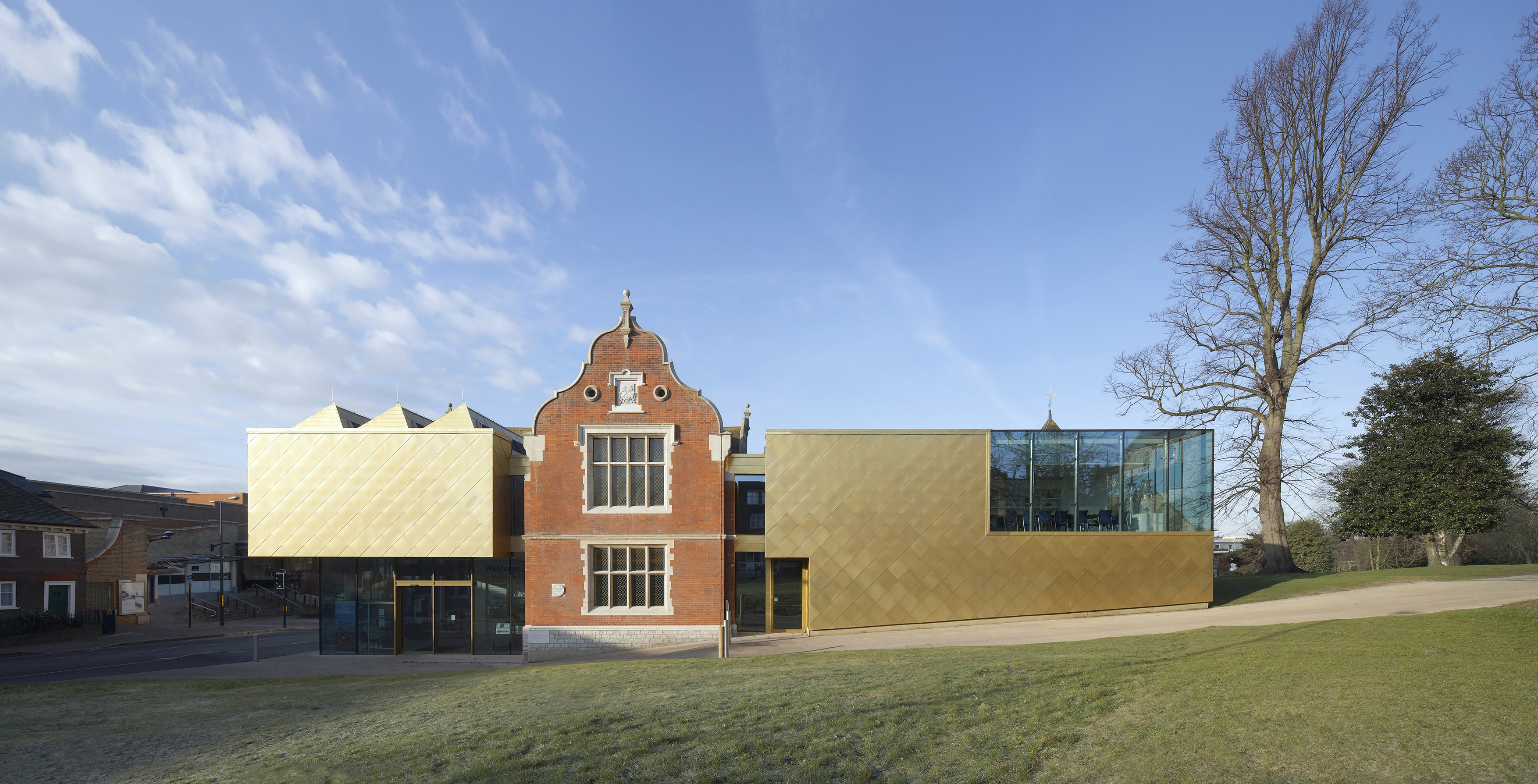 The two gold copper alloy shingle and glass clad extensions have been added to the Elizabethan manor that is the core of the museum.