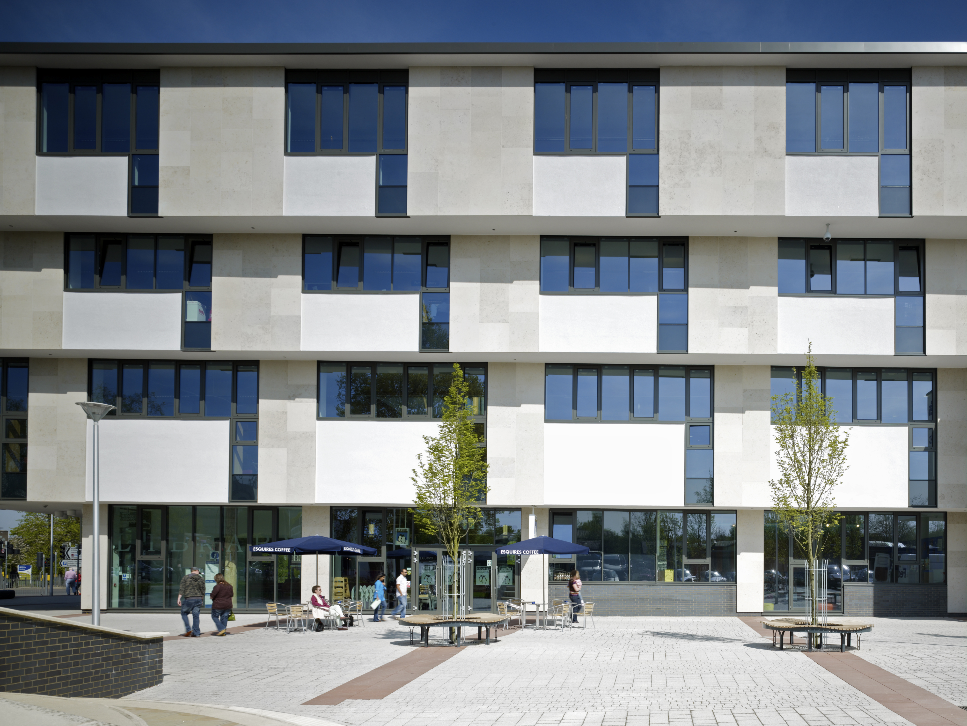 Facing onto a new public square, the four-storey building, which has a limestone and glass facade, was designed to be a landmark for Crawley town centre.