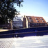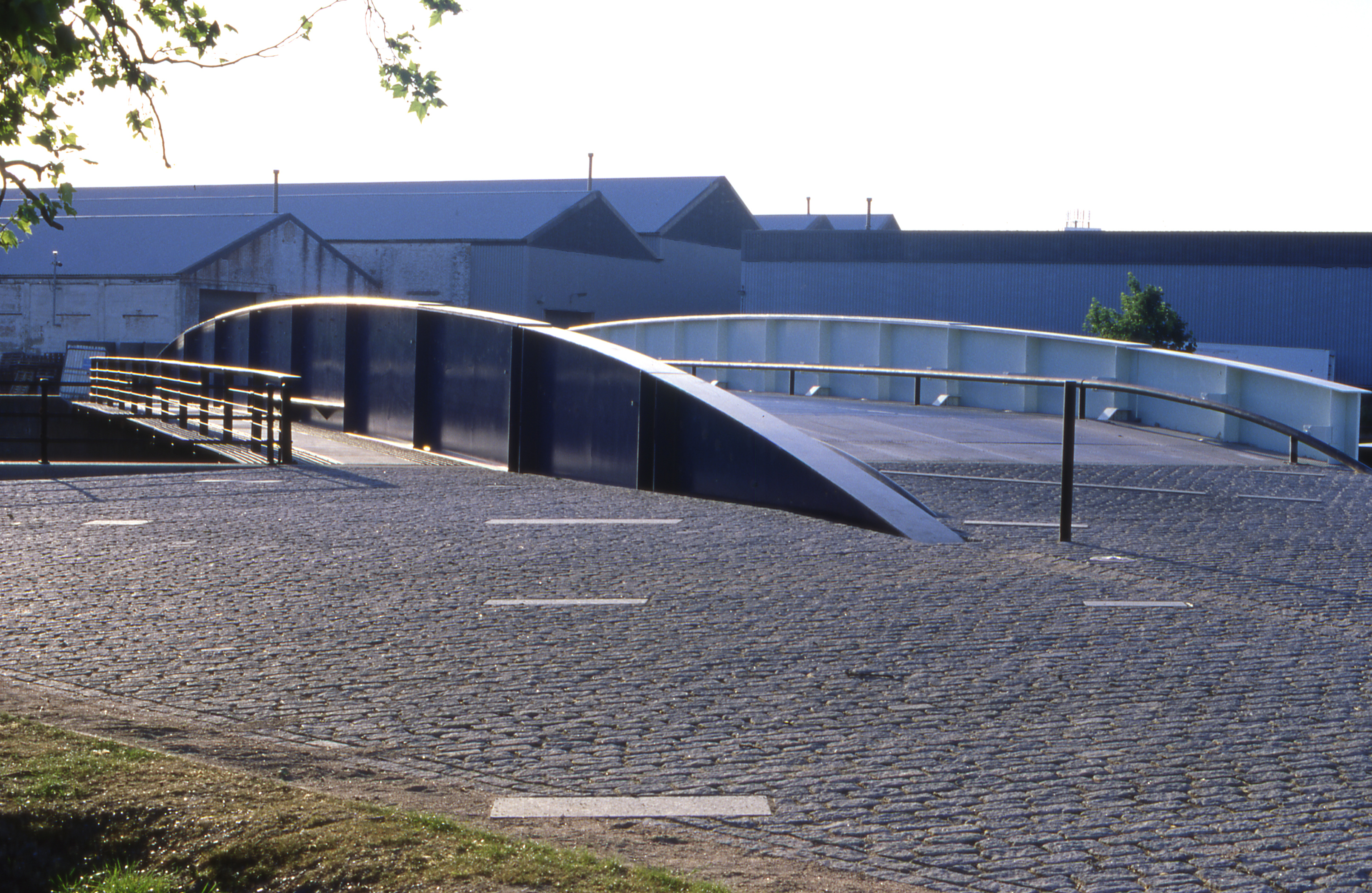The bridge is formed from welded steel plate girders with a mesh deck, and cantilevered footbridge. Three lines run along the girder with intersections marked by penetrations, stain¬less steel studs and openings sheathed in gold leaf. A new kite shaped square crosses the line of the bridge and road and leads onto the new steel park gates painted silver, gold and bronze. The entrance comprises a 7m high crowd gate, anti-motorcycle gate, teenagers gate, infants gate and catflap.