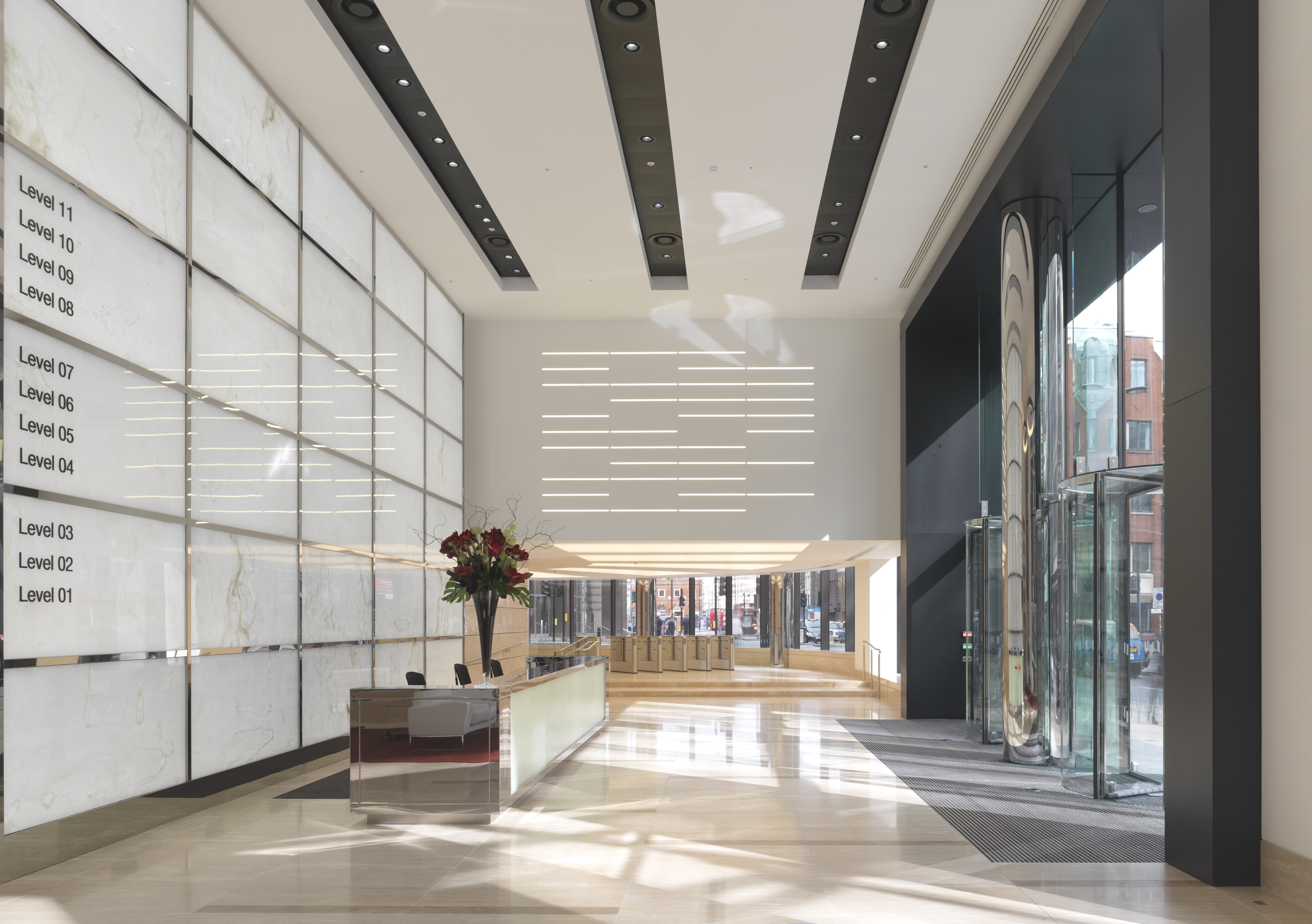 New cladding has been installed at both ground and mezzanine level, using black anodised aluminium and full height glazing to provide a contemporary identity to the building.