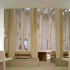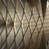 Exterior cavity walls are of Clipsham stone (a limestone very like that of the original buildings) on the outside, but white-painted (over plaster) brick on the inside. The internal structure is of glulam wood whose tapered columns rise into criss-crossing arched beams. The frame supports a roof that is flat on the outside, but internally takes up the shape of a boat’s keel