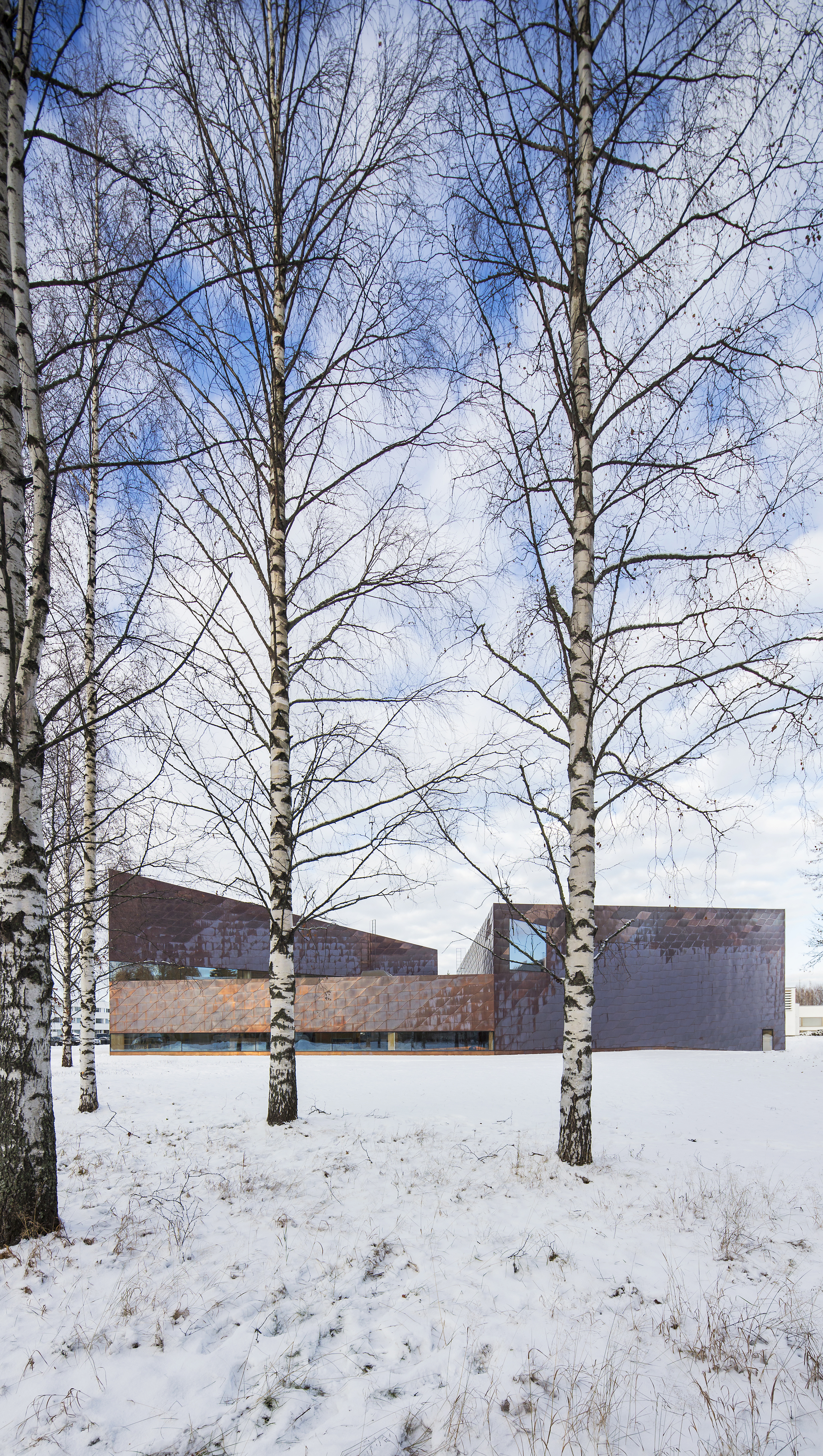 The comprehensive expansion is connected to the original library by an underground link. The extension consisits of three interlinking sheds the walls and roofs of which are clad in dark copper.