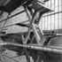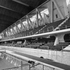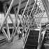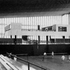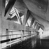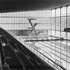 Internally the square building is split in two by the concrete spinal frame that runs down the centre of the building and supports the cantilevered steel roof trusses. This spine contains the main concourse which divides the building's two main functions, the swimming pool and the main arena.