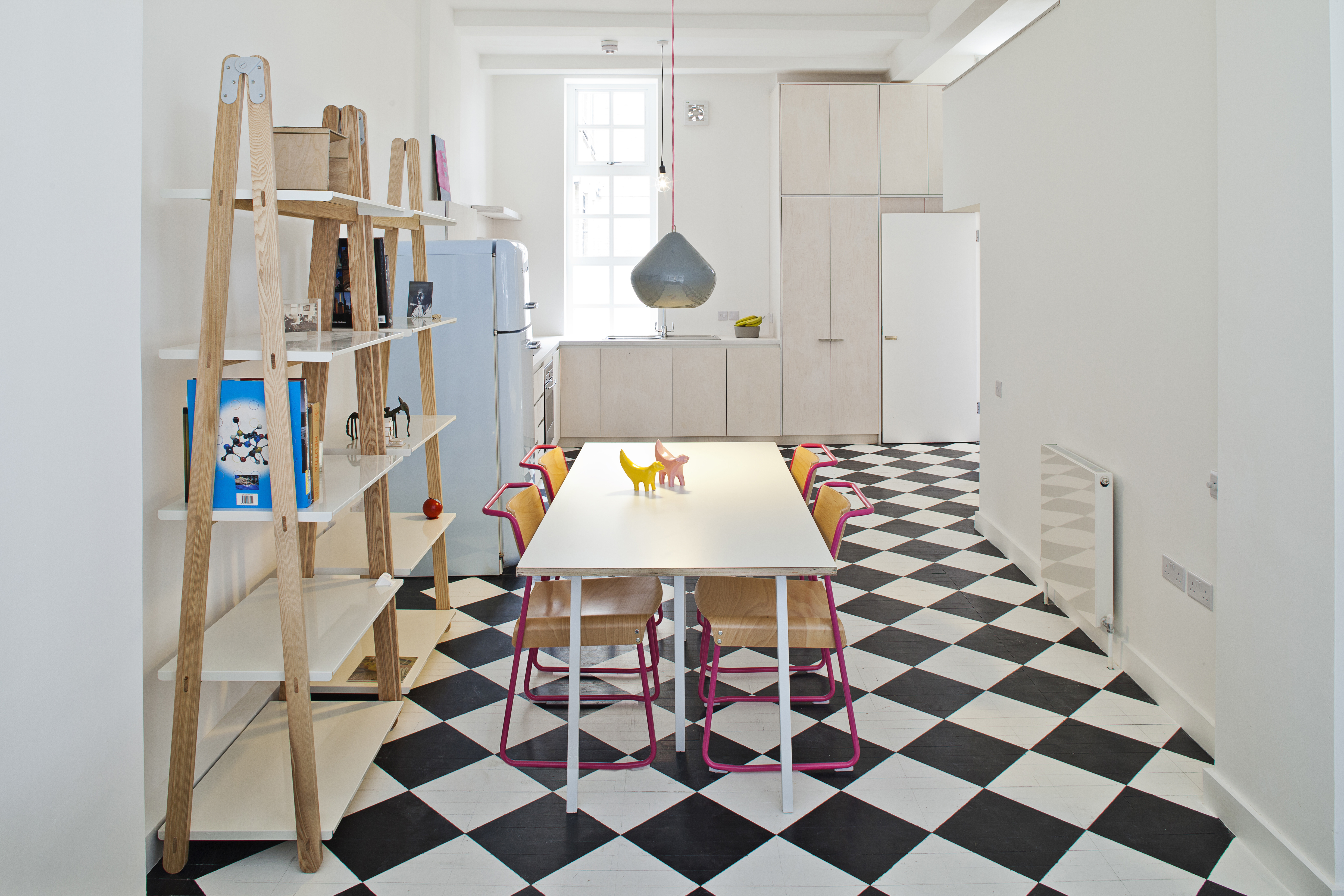 A new window was inserted into the east wall and the kitchen was relocated beneath it to create a dual aspect living space. This allowed for a spacious bedroom to be located to the western end of the apartment next to the original windows. Full height double doors allow the bedroom to be closed off for privacy.