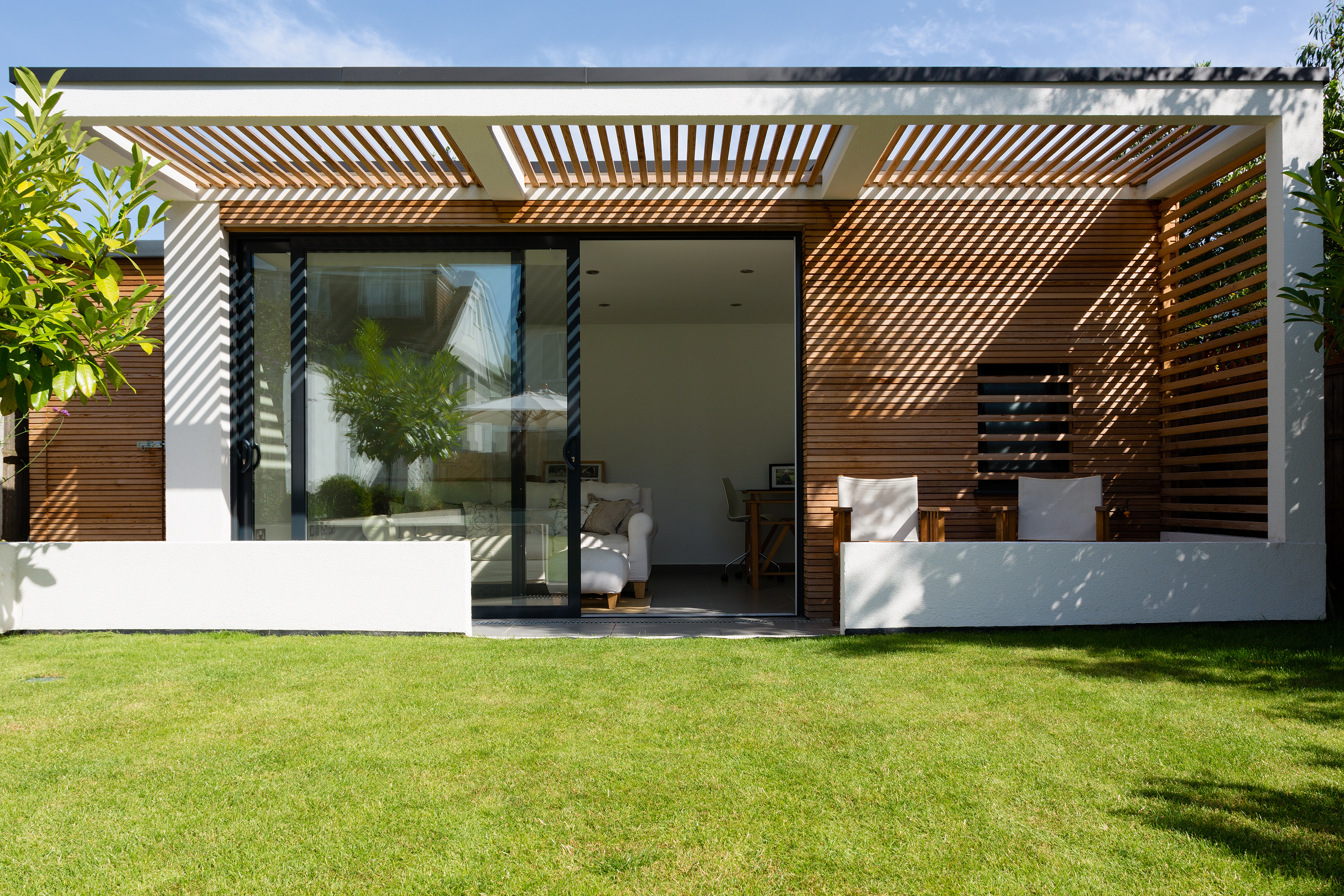 Western red cedar boards were used to line the external walls and form brie-soleil on the roof of the garden room, whilst softening up the rendered walls. The walls themselves extend into and wrap around the remodelled garden to form planting beds. Internally an open plan kitchen, dining and living area is serviced by a new utility and WC.