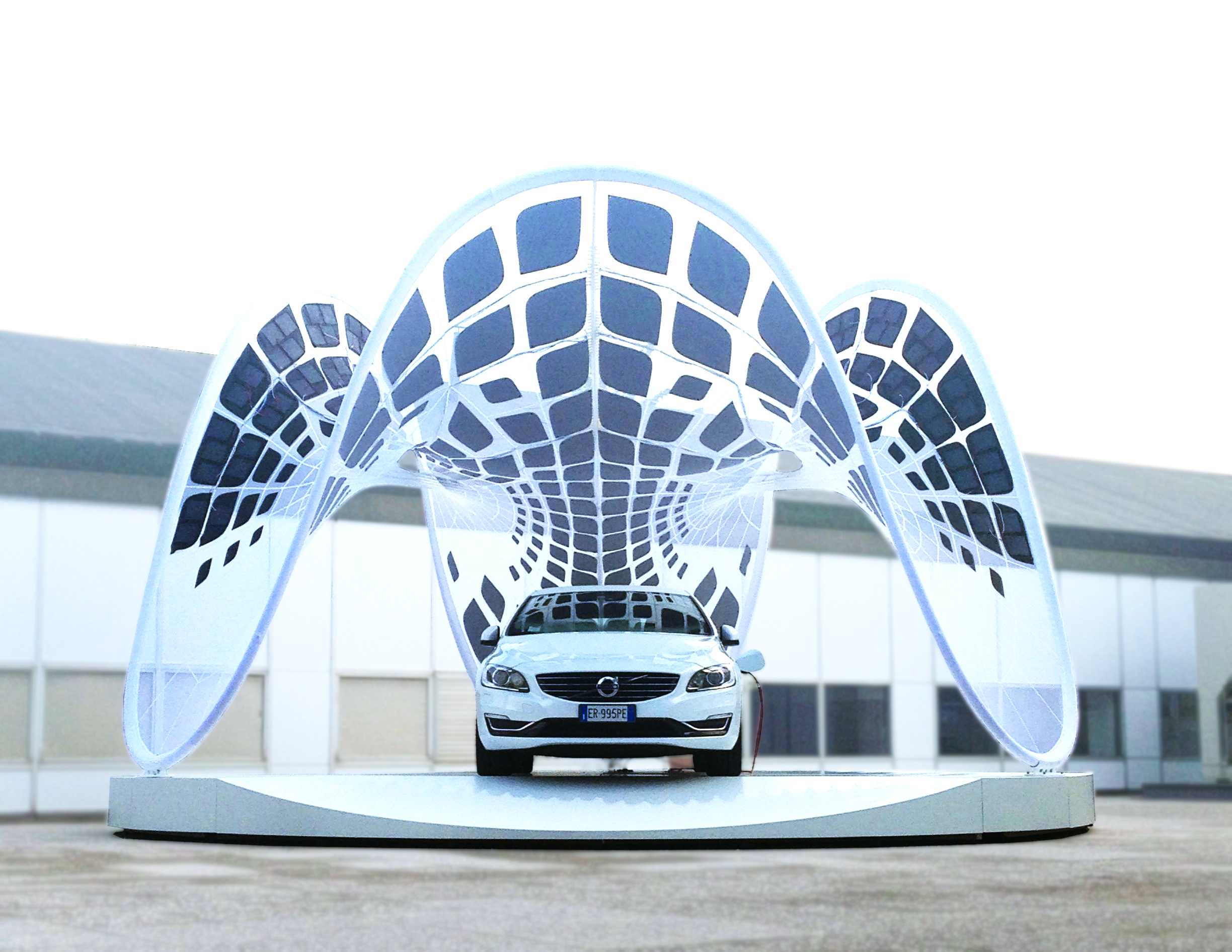 The Pure Tension Pavilion is a portable, solar-powered tensile membrane structure commissioned by Volvo Car Italia for the new Volvo V60 plug-in hybrid electric car which not only charges the car but also flat-packs to fit in the trunk of the car and assembles in less than one hour. It is an experimental structure that, similar to a concept car, is a working prototype that speculates on the future of personal mobility and alternative energy sources while also exploring digital design methodologies and innovative structural solutions.