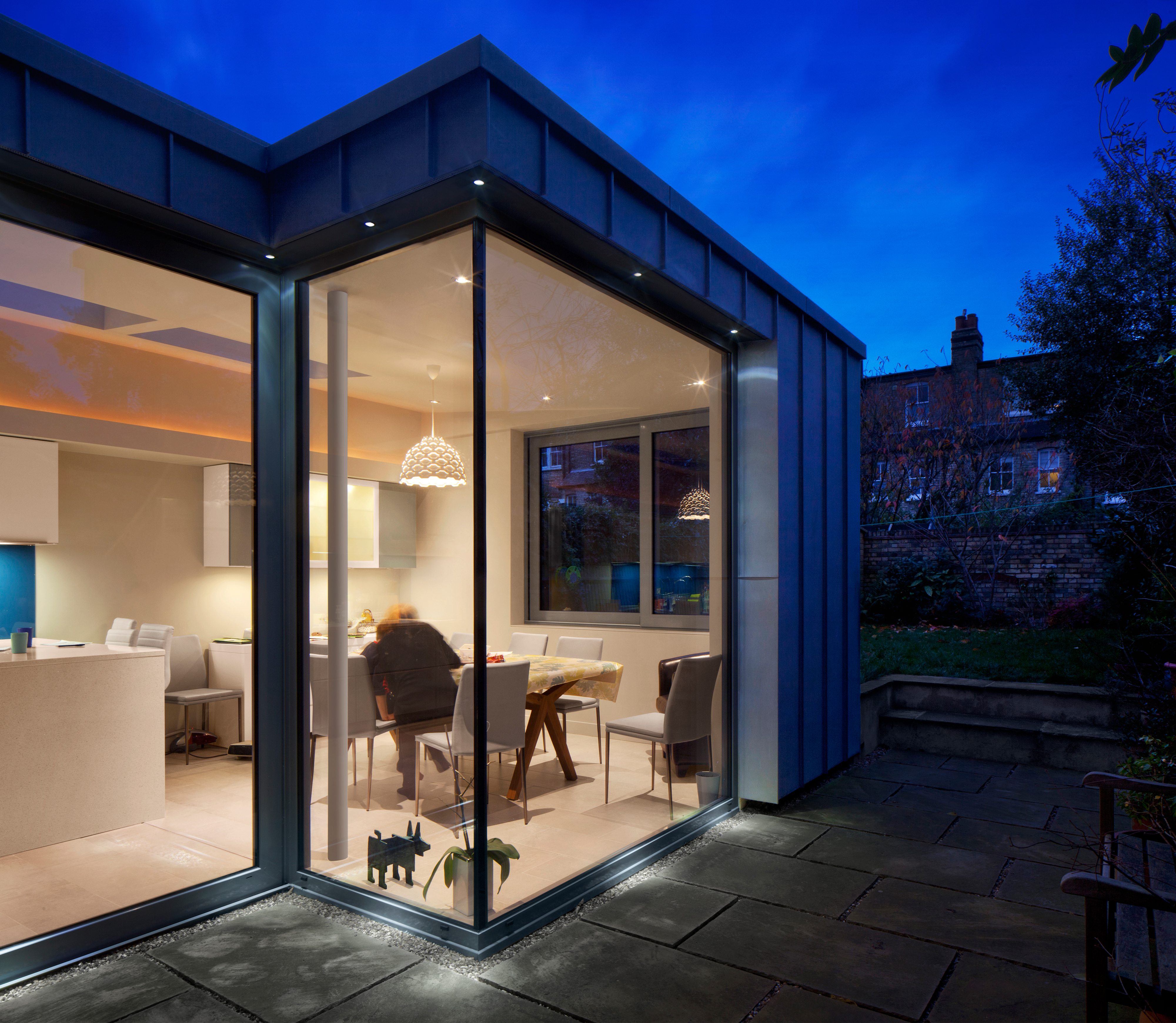 To improve the living spaces the toilet and utility room are hidden in the heart of the plan. The dining room is placed next to the garden. Diagonal views between the various areas of the living areas are created with full-height corner windows. This blurs the distinction between the interior and exterior spaces. The new extension is clad in zinc that contrasts with the existing traditional details