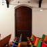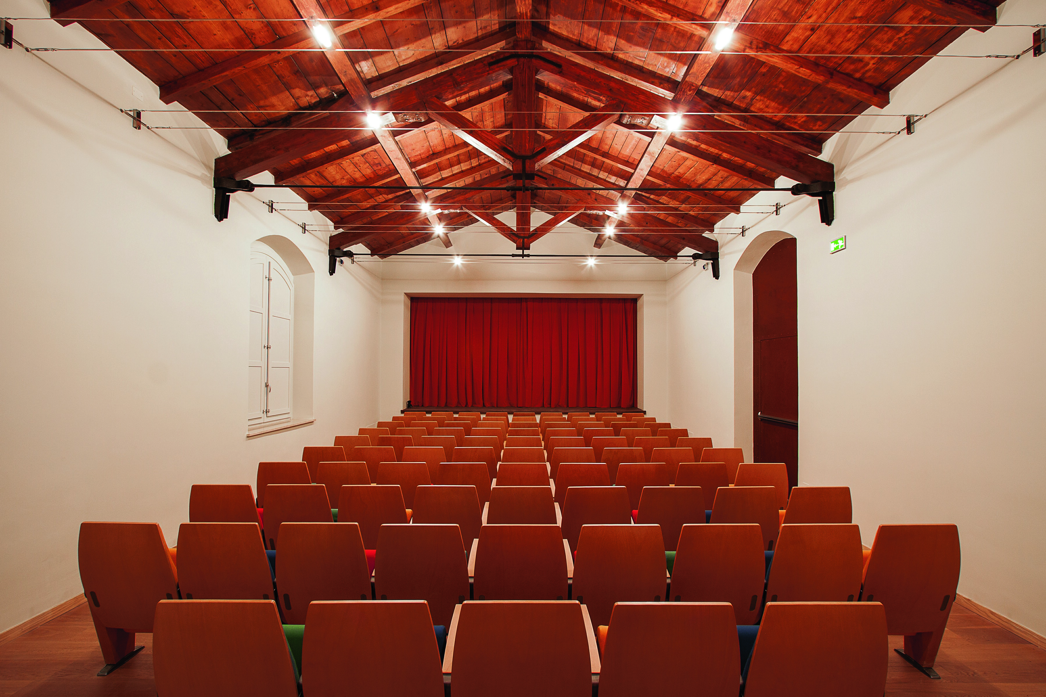 Internally the linear shaped building is articulated into five parts: 1) foyer, wardrobe, ticket counter and toilets with its graphic and chromatic inserts on walls ceilings; 2) theatre hall with its original wooden truss roof and wooden upholstered chairs in four different colours (red, blue, yellow, green); 3) the stage, with its rust colour curtain; 4) a puppet exhibition hall with handcrafted masks and puppets; and 5) a didactic workshop area.