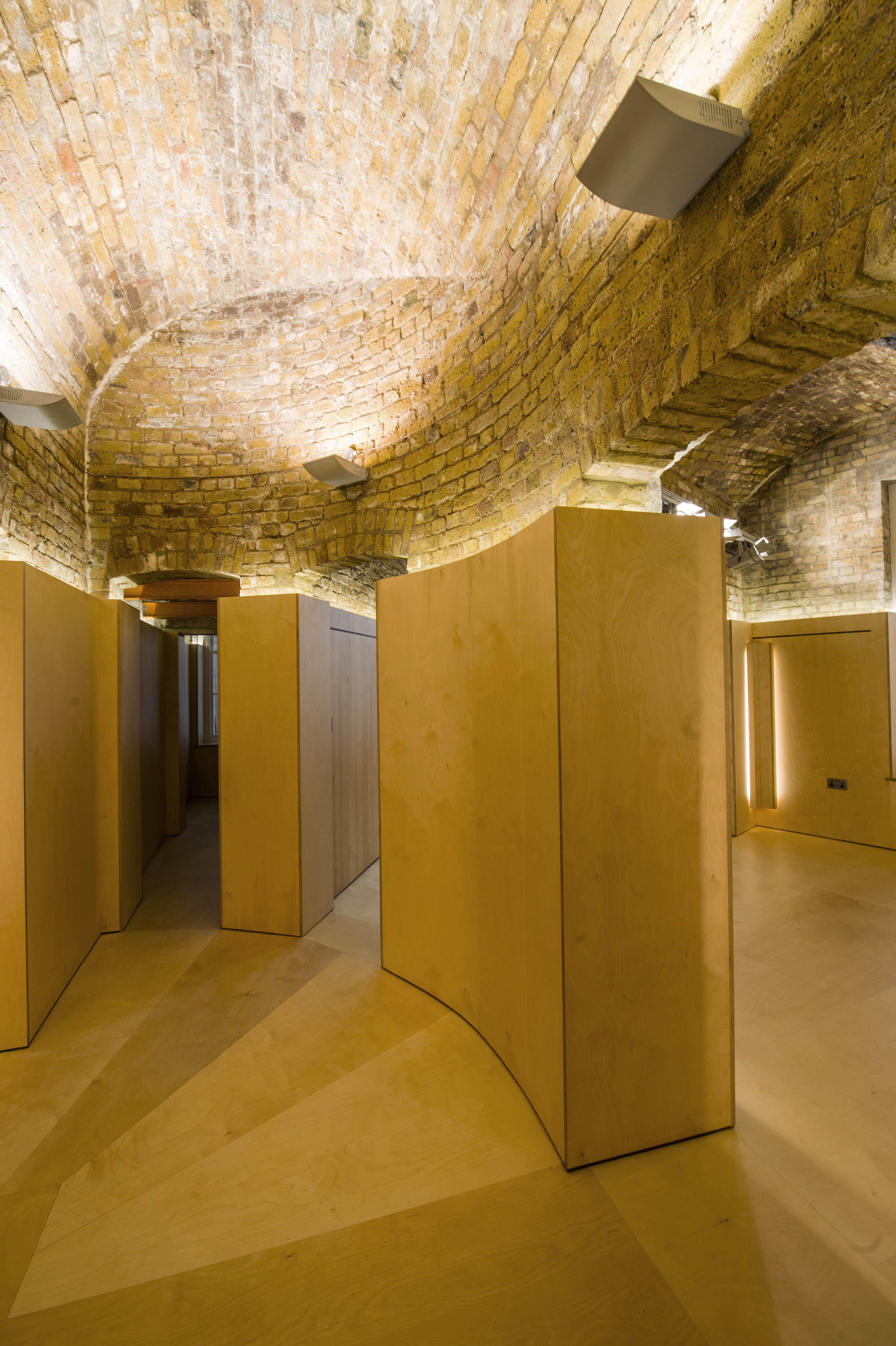 Once the almost grotto-like quality of the existing spaces had been revealed and restored, the challenge was to create a dry working environment within a fundamentally damp structure. The new plywood lining to floor and walls is conceived as a singular installation within the original monolithic architecture.