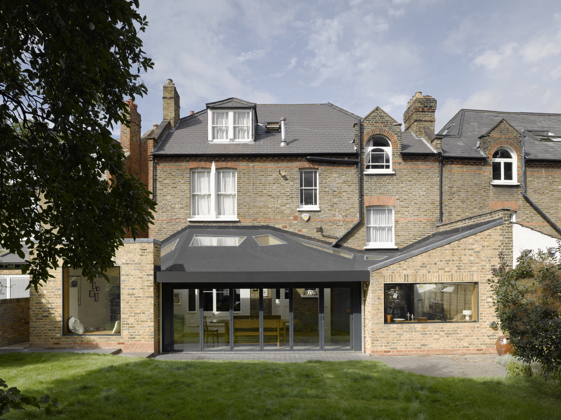 Full width family room rear extension, an infill between two partially retained existing extensions, uniting them with a folded rubber roof