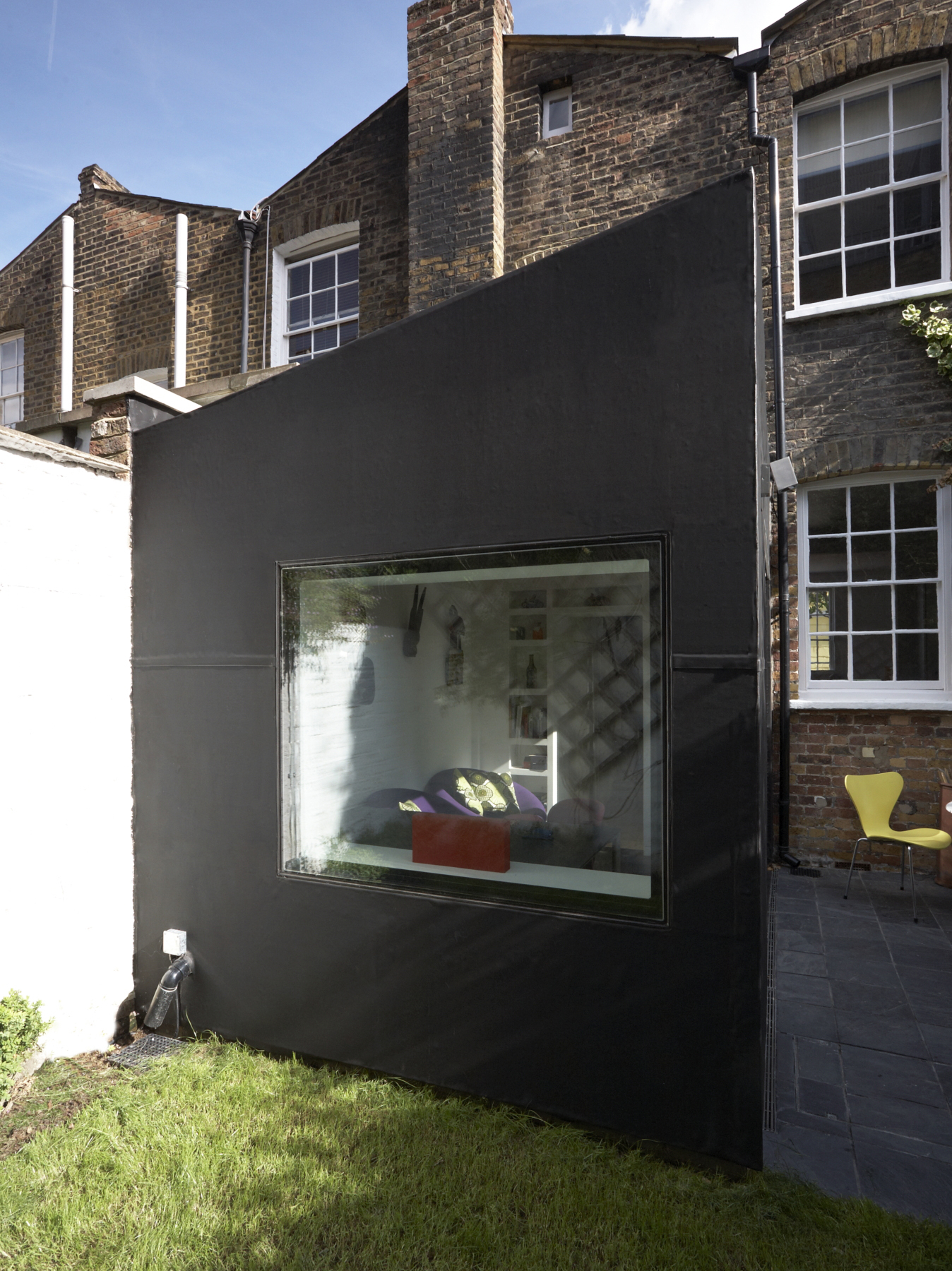 A ‘shadow’ of the building has been constructed in matt black rubber in the back garden. This ‘shadow’ casts a further ‘shadow’ of dark state in the garden.
