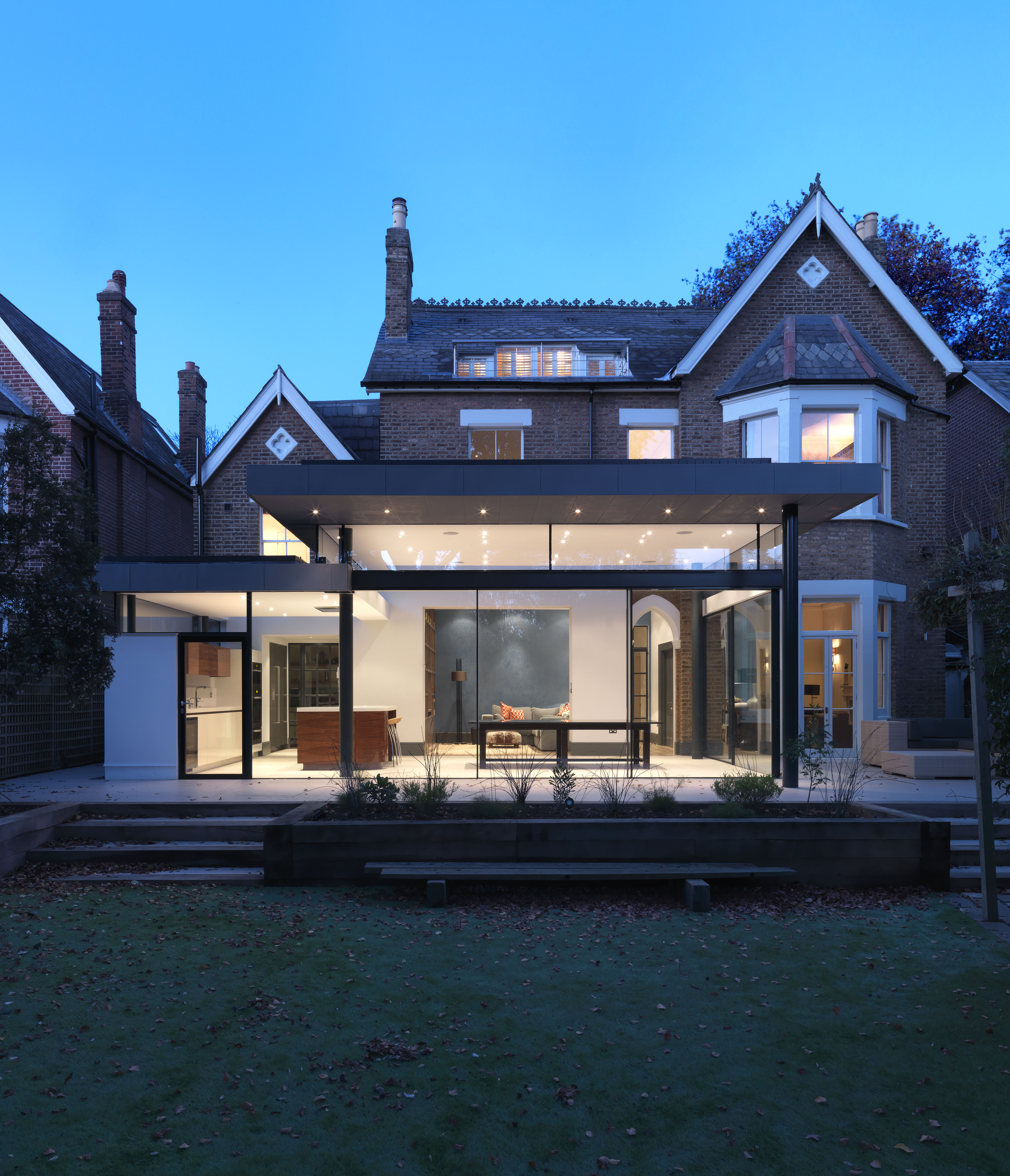 Varying ceiling heights are dictated by the function of the spaces and are sympathetic to the original Victorian features such as a large striking crittall door, detail on the brick façade and bay windows. The roof (which is lower than the original conservatory) slopes towards the neighbours to reduce the scale of the extension where it meets.