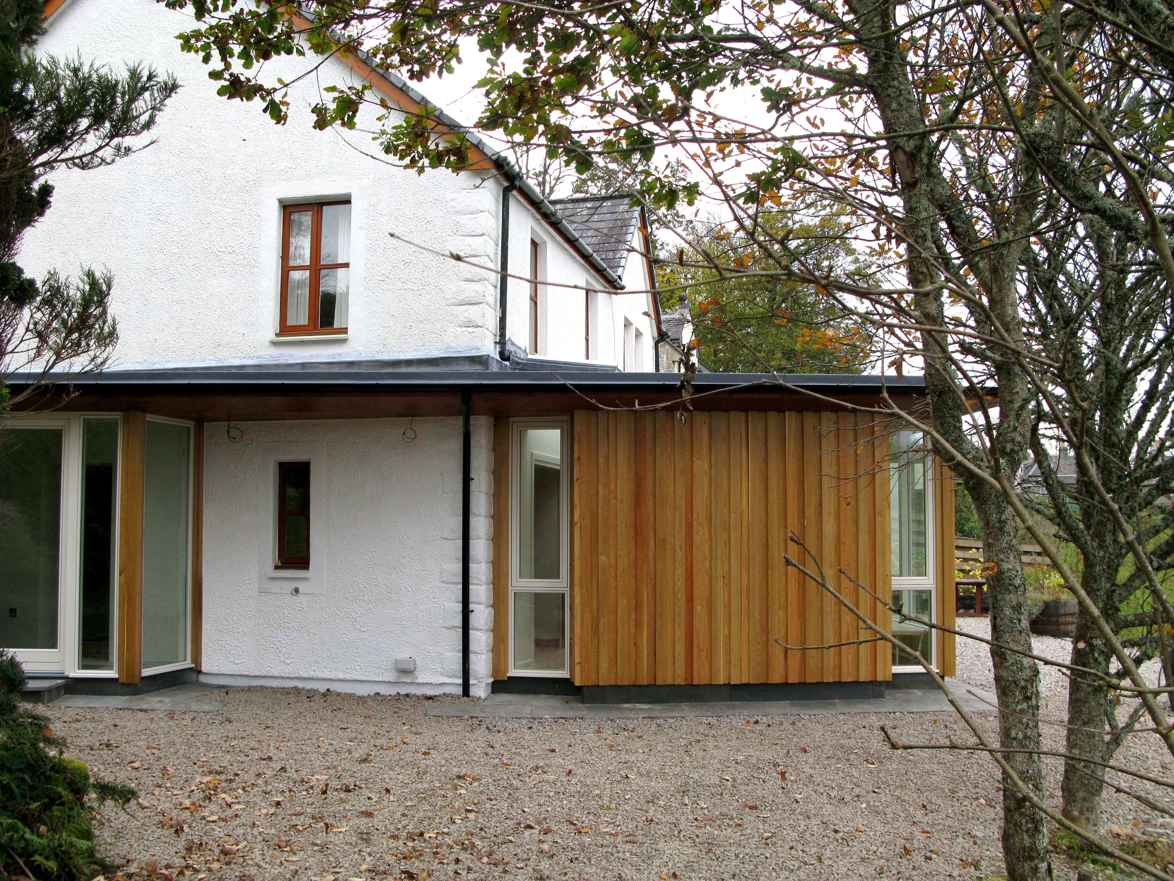 Our design pulls the two elements together wrapping the extension round the house. To provide privacy, larch cladding screens the dining room from unannounced visitors. The extensive glazing to the south and west maximize the stunning views. A glazed slot roof light creates a sense of separation between the new element and existing building and brings daylight into the kitchen.