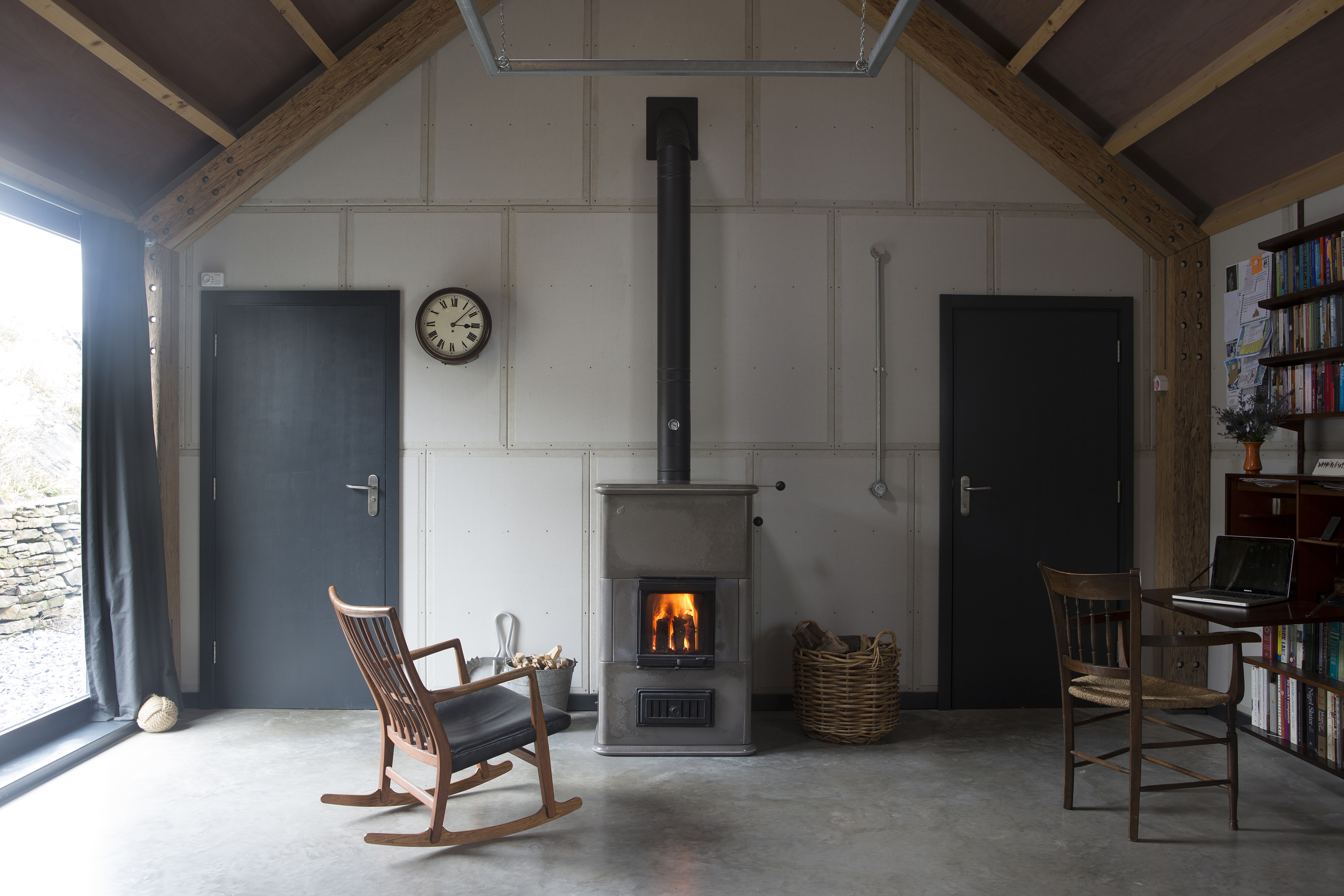 The material palette is one of practical economy; externally, stained timber cladding and corrugated sheet; internally concrete floor, dry lining boards to the walls and plywood to the ceiling. Heating is provided by two Dutch tile stoves, one in each main space with power in exposed conduit ducting.