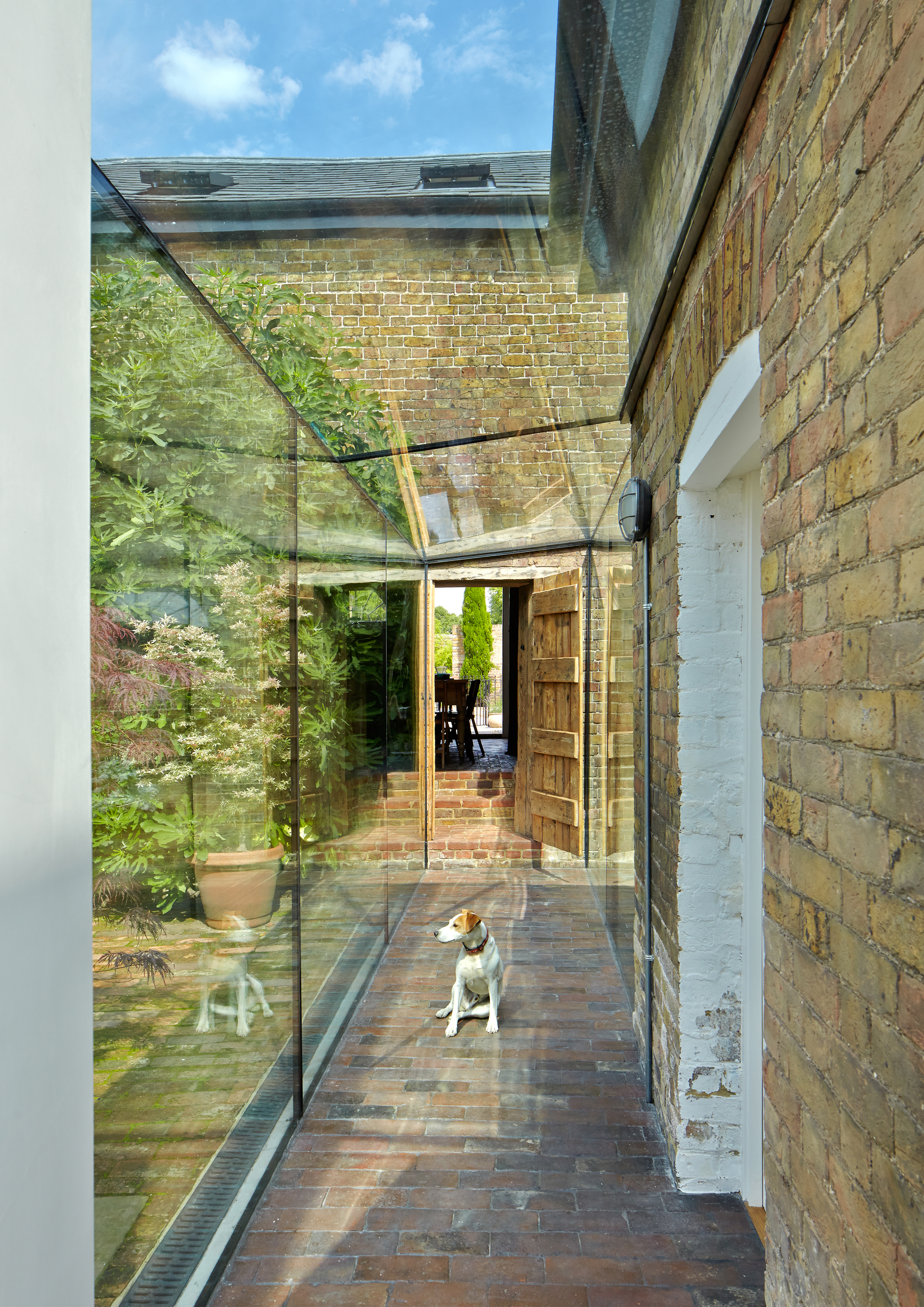 Farningham House Cottage is an 18th Century Grade II listed property in the picturesque Kent village of Farningham, adjoined to a large Georgian house lived in by the client’s parents. The intervention is a glazed passageway linking the cottage with two outbuildings, an existing stables and workshop. All buildings face onto a shared courtyard.