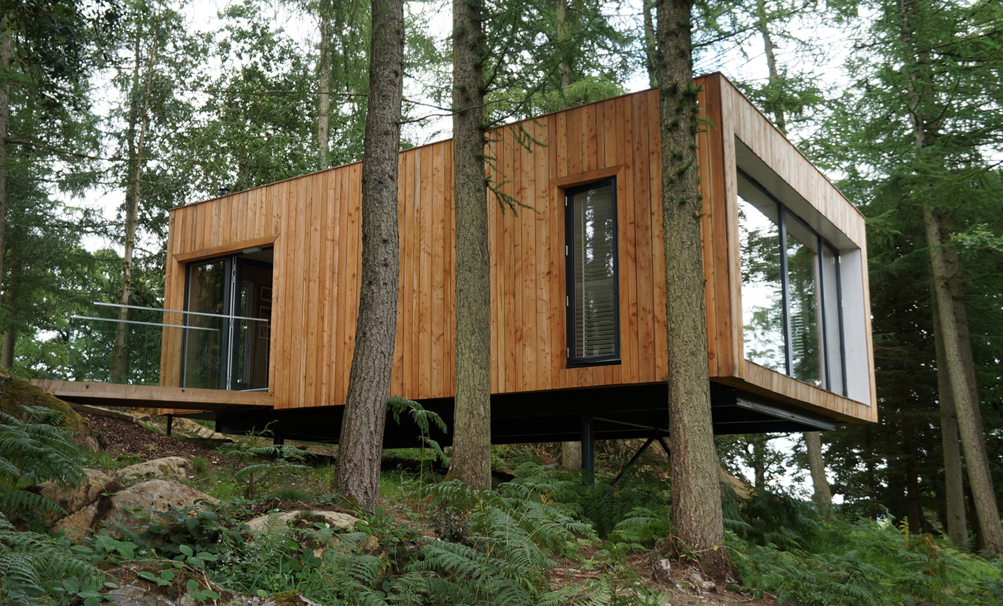 The building, an 'elegant box in the woods', was to be located in a sloping woodland site adjacent to a private tarn. The building was constructed from timber panels made on site, finished in locally-sourced and milled larch with grey powdercoat, aluminium-clad redwood windows and doors. The roof and guttering is hidden beneath the cladding.