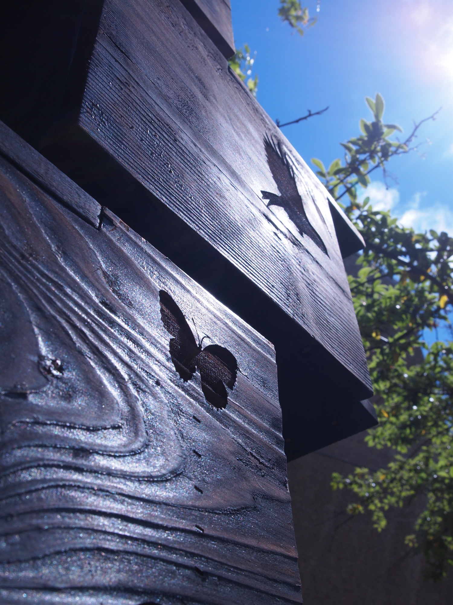 The timber boxes were laser etched, then charred to provide protection and a monolithic aesthetic quality. The totem pole design was developed by Collective Architecture in association the Eco Groups at two local primary schools.