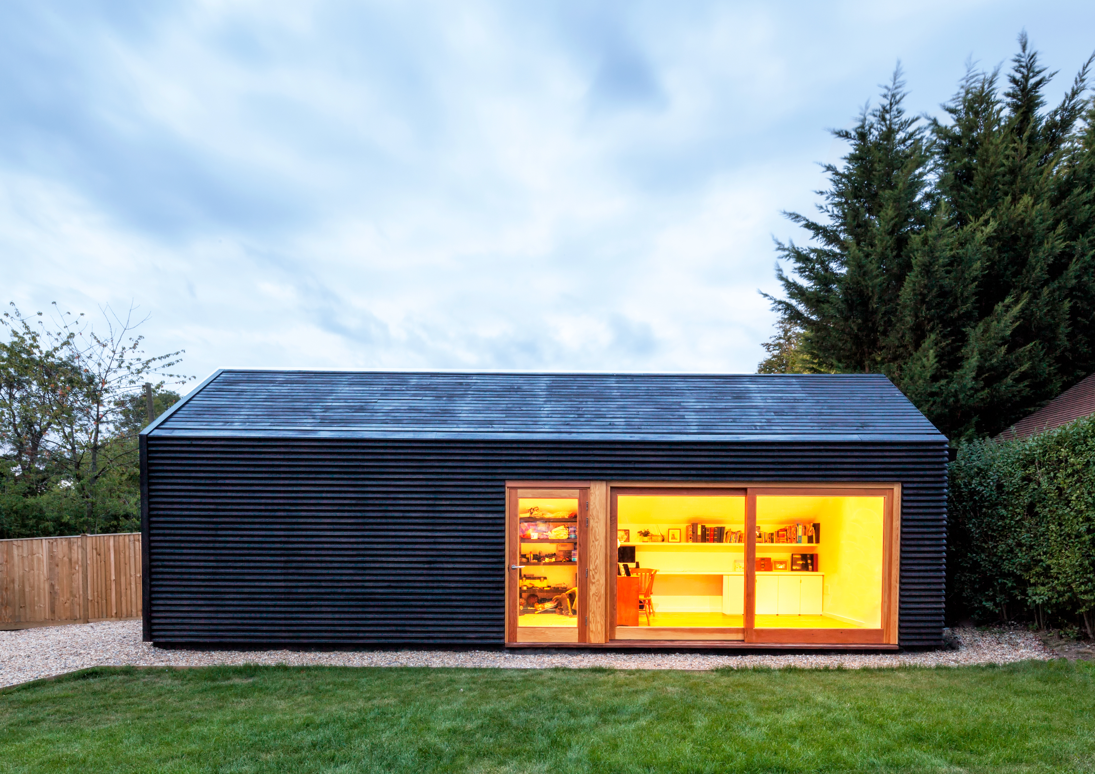 The design is a simple freestanding building that houses a variety of functions - office, storage space, play area and garage - under one roof. Its structure, inspired by barns and outbuildings found in the local area, complements the existing cottage while providing two distinct spaces: a workplace with storage space and a garage.