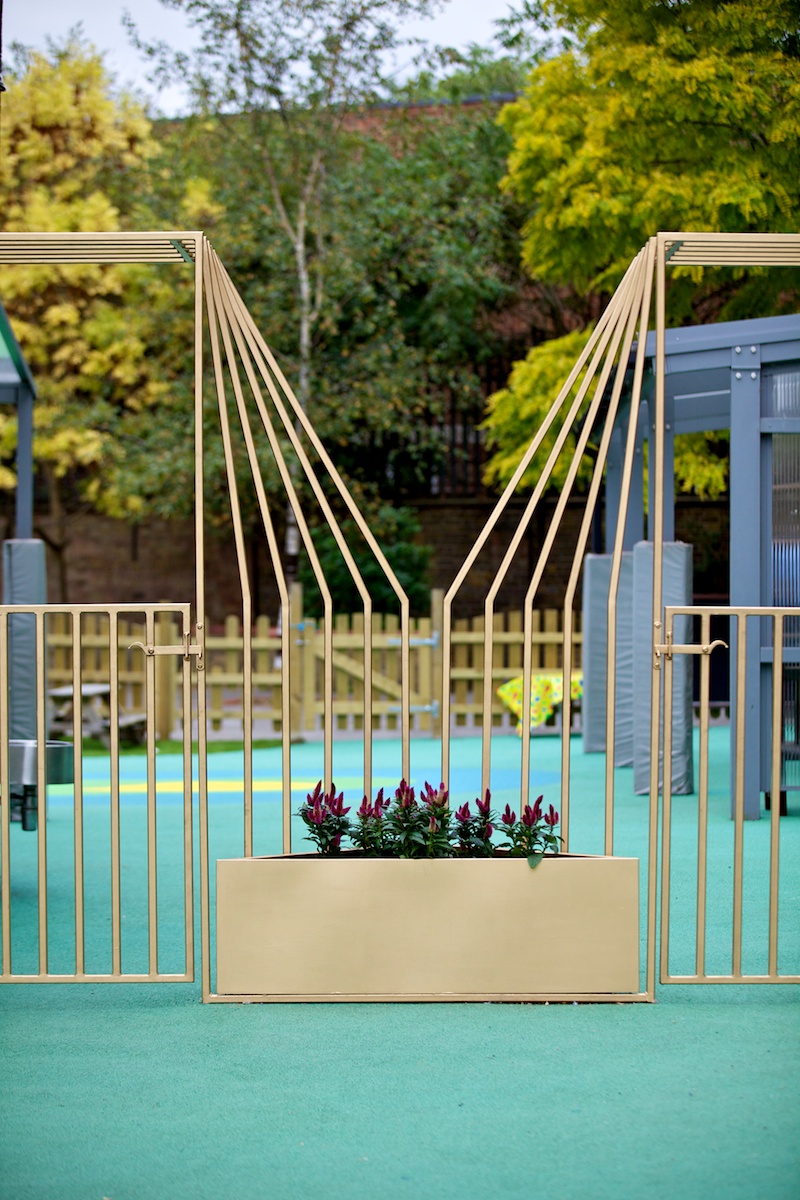 The gates are made from thin metal sections painted gold, like lines on a drawing creating a play on the geometry of the letter ‘Y’ taken from the schools name. These lines fan out in rainbow formation, down to golden flower pot.