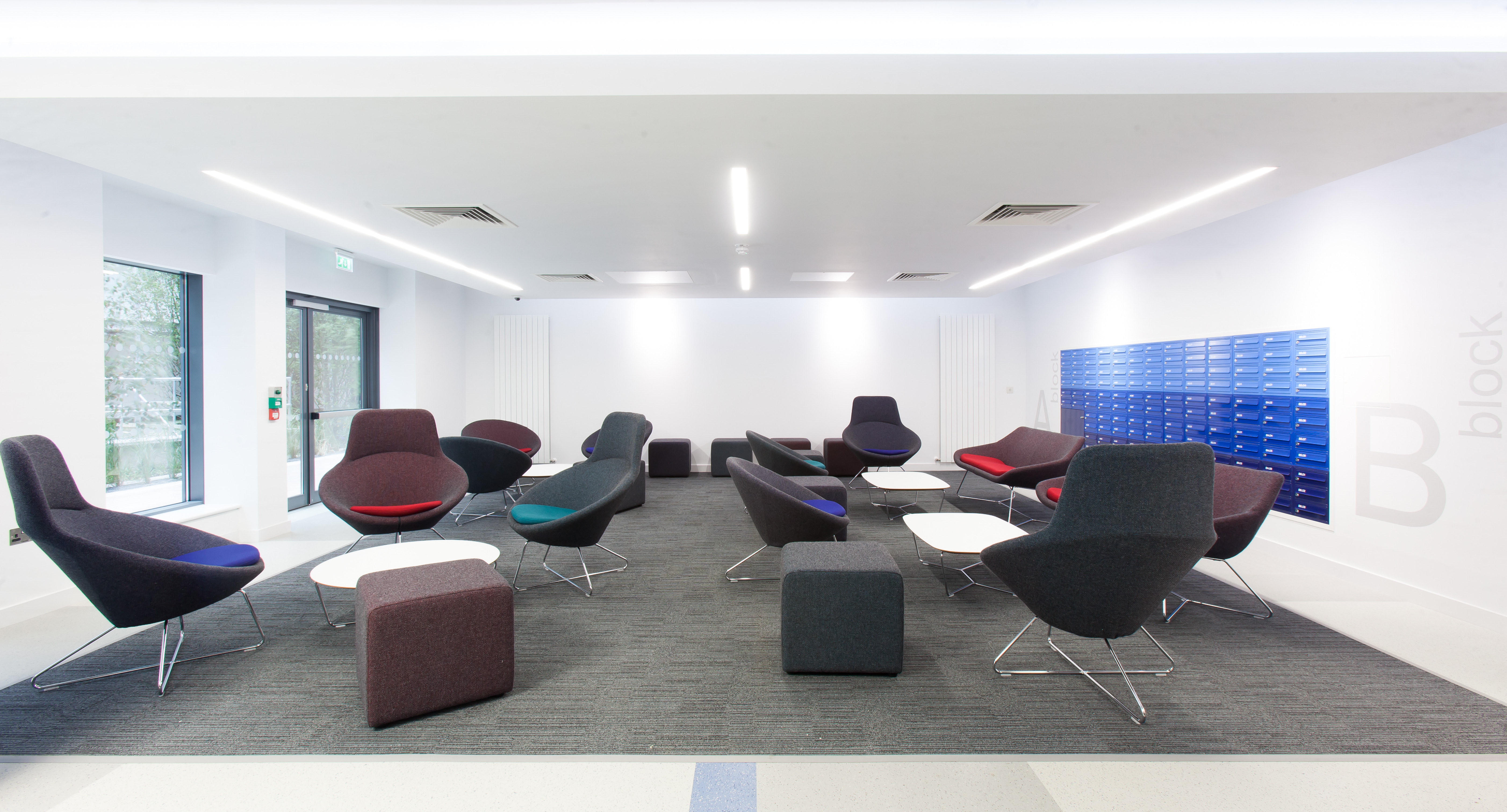 The brief was to fit out the shell space created under the main building contract and provide a vibrant new space to allow students to socialise and study. Moving away from the traditional, unloved common room, the architect sought to create a series of both formal and informal spaces which could offer the students the choice of either sitting separately or in groups, therefore promoting either individual or group work. In addition, a separate quiet area is screened off by a full height glass partition; within which “hot desks” are lined against a perimeter wall and plectrum shaped desks facilitate group working.