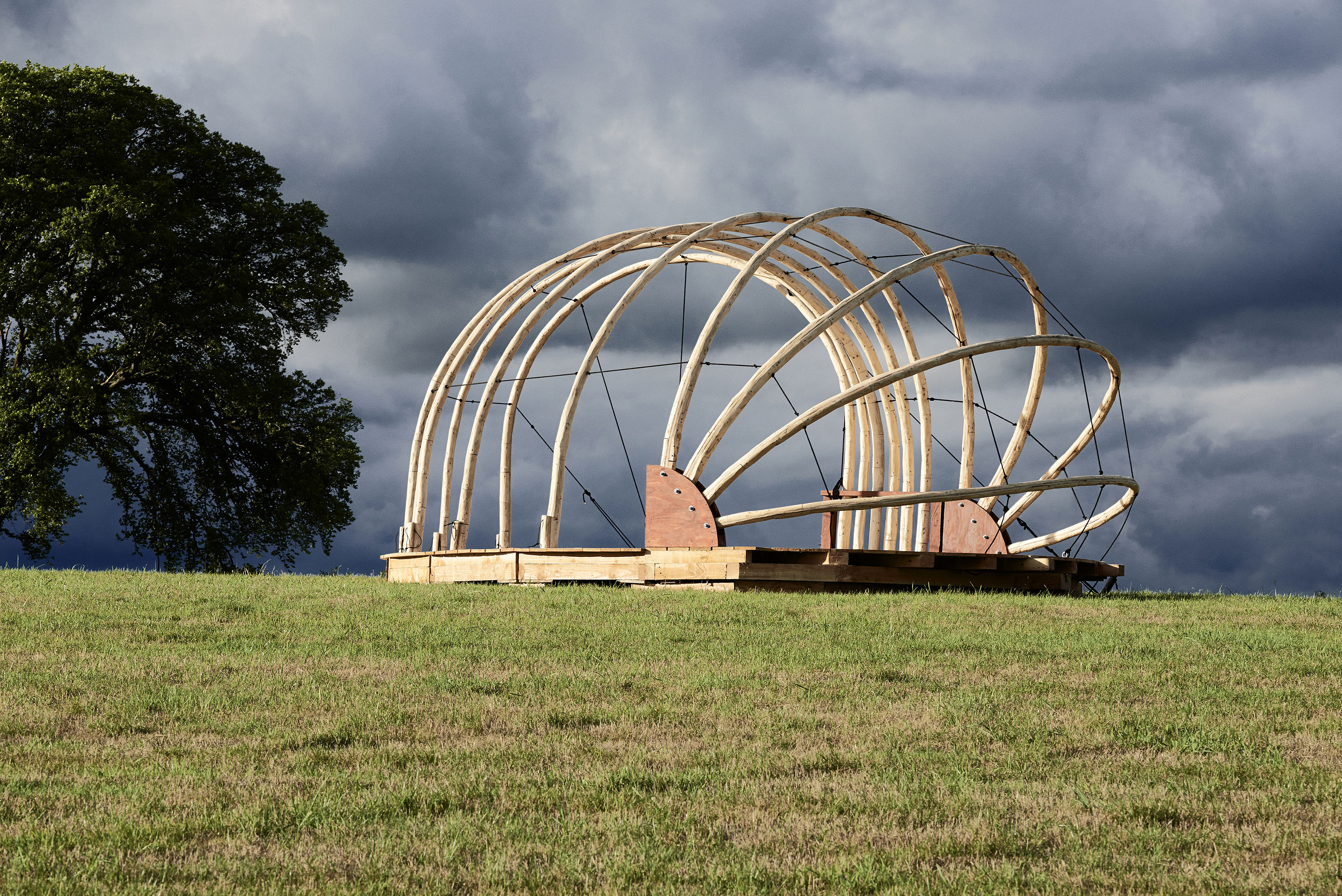 The collaboratively designed structure can be assembled in less than 5 minutes by 2 people and transportable in a small trailer, resulting in a reception space that can be used as an exhibition structure for travelling art shows and events. A canvas cover will be pulled over the ribs to weatherproof the building in future years.