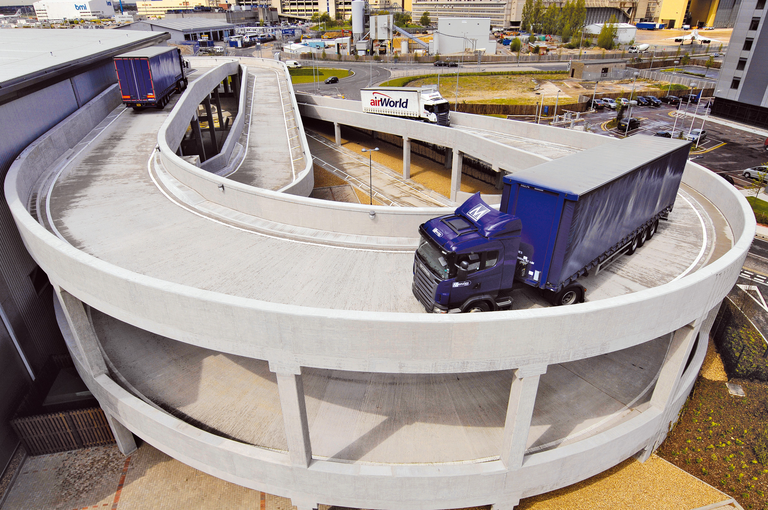 Industrial warehouse facility at Heathrow Airport over two storeys. Each level has its own service yard areas with upper level access via two one way ramps.