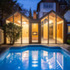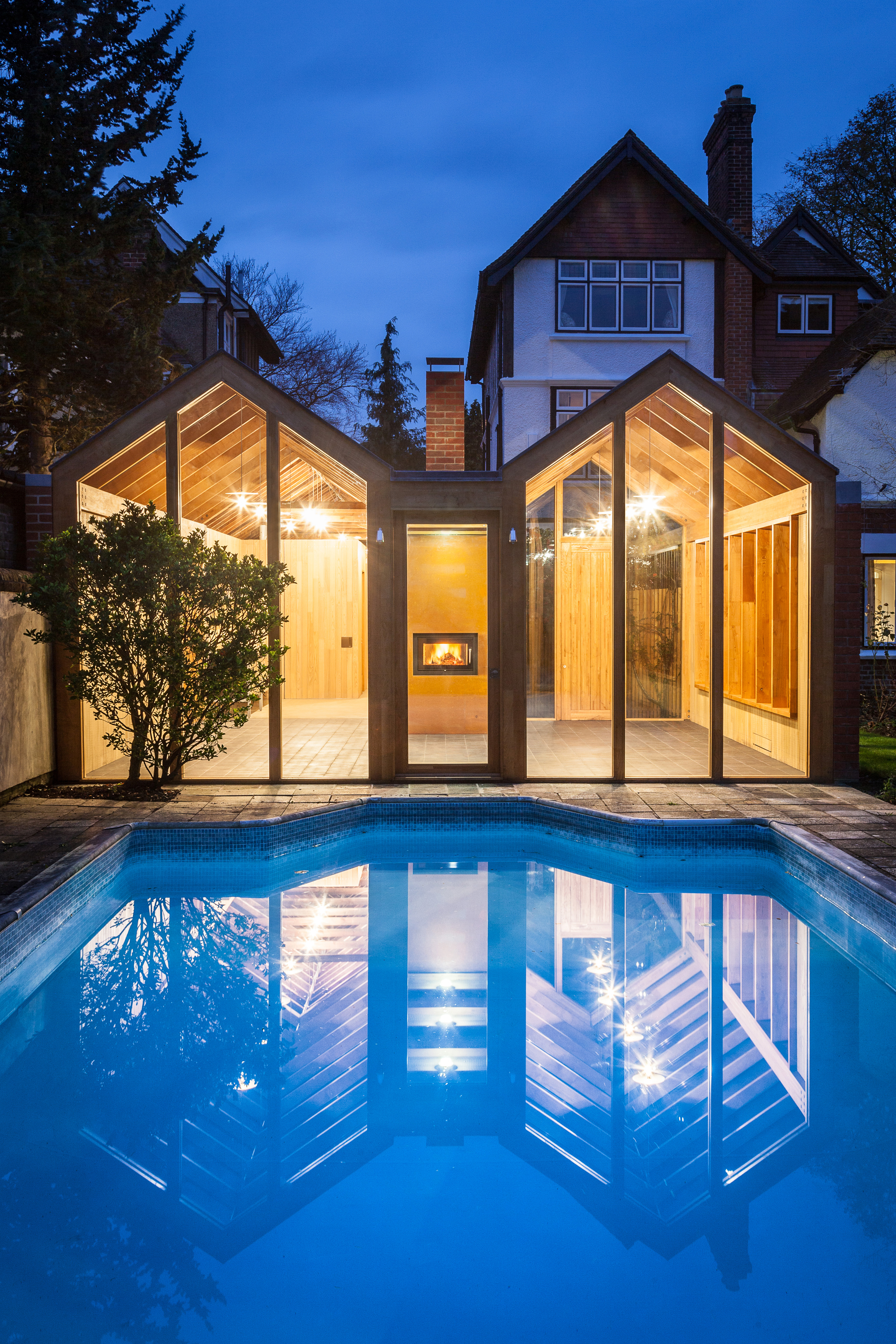Situated within a suburban context the property occupies a narrow site alongside the boundary wall between two large houses. The outlook is over a communal garden and pool.