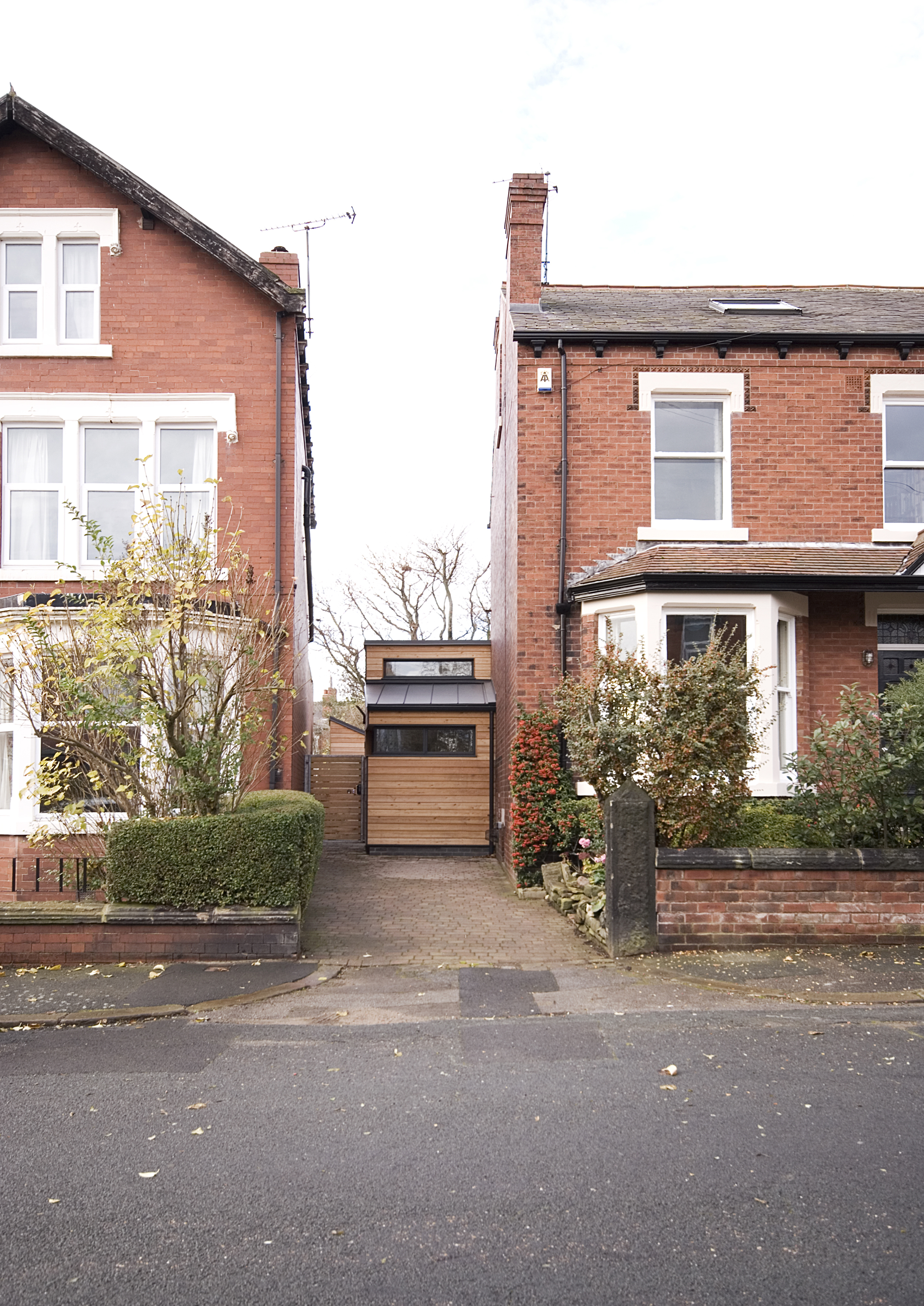 The steel and timber framed extension is clad in larch, with a standing seam metal roof covering. The aluminium windows, doors and rooflights complete the envelope. The roof form reflects the internal level change and reduces the scale to the street frontage.