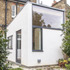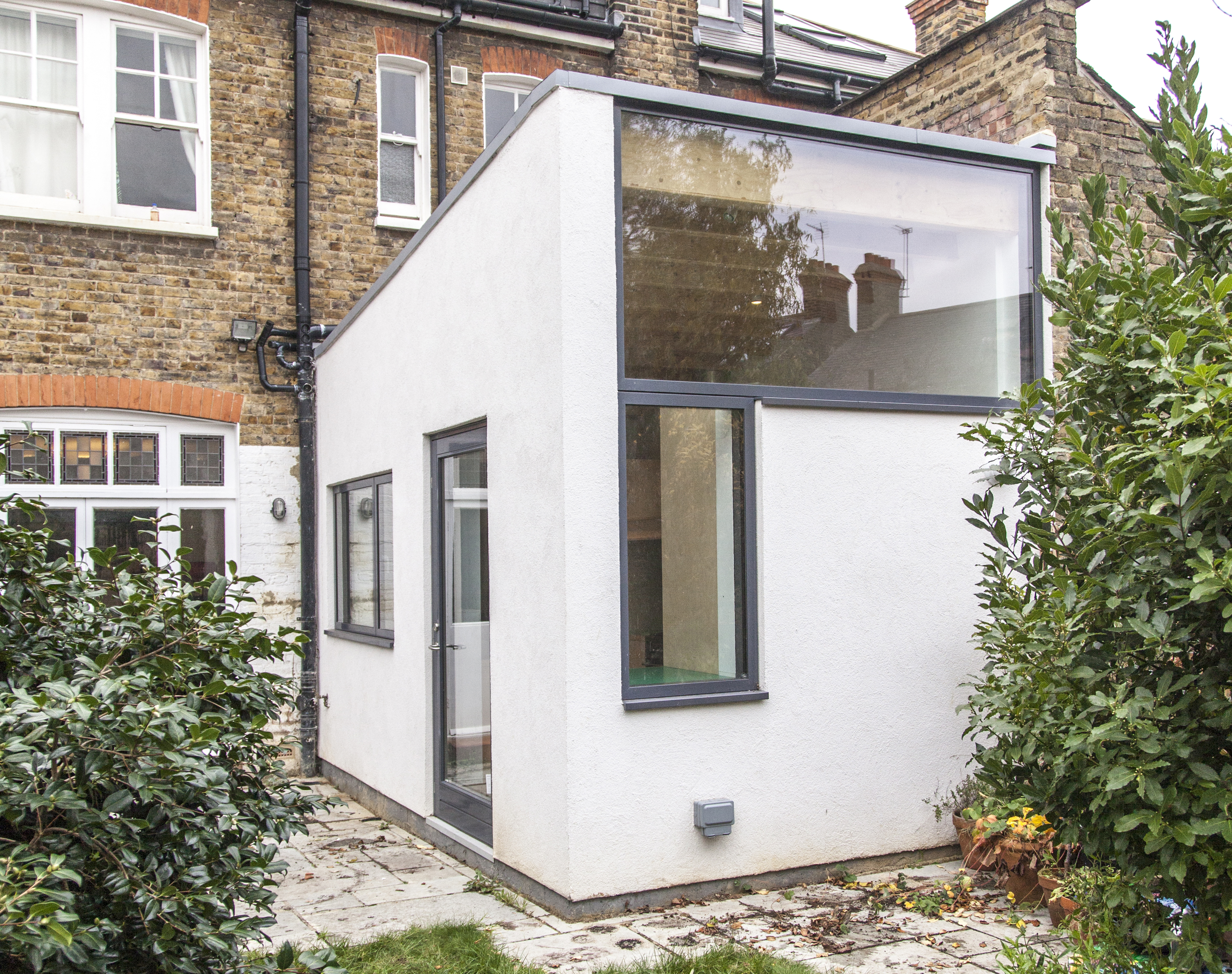 A simple white rendered volume with a sloping roof and a glazed end was proposed. In addition, the architects opened up the existing living room arrangement and designed new bathroom and WC facilities.