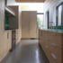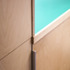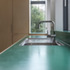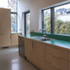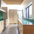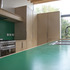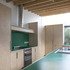 A glazed corner at the end of the run of kitchen worktops affords a person standing at the sink discreet views of the garden, without loss of privacy. Birch plywood door panels mirror the timber finish of the raked ceiling and contrast with worktops of deep viridian.