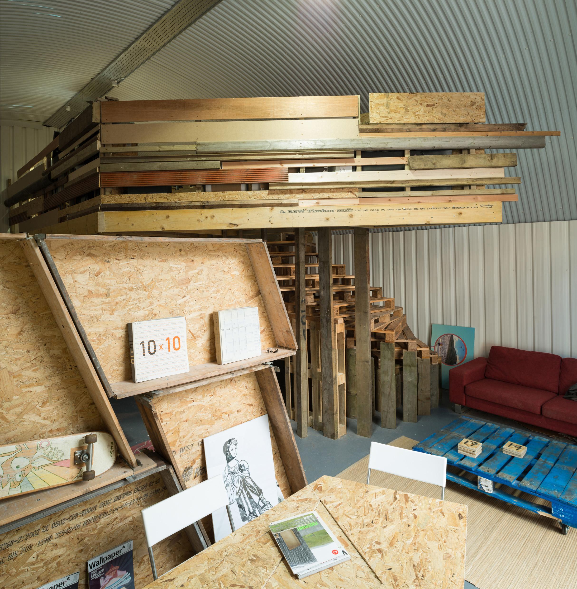De Anderen is a creative space conceived by Tom Scholefield [Konx Om Pax], and Joanna Nethery [Distill]. The space has been created out of reclaimed timber that was donated by a fencing contractor, second hand timber pallets and packaging crates. These materials were utilised to construct a dynamic mezzanine space that sits as a piece of sculpture within the context of the existing railway arch incorporating a spiral stair made from the old timber pallets.
