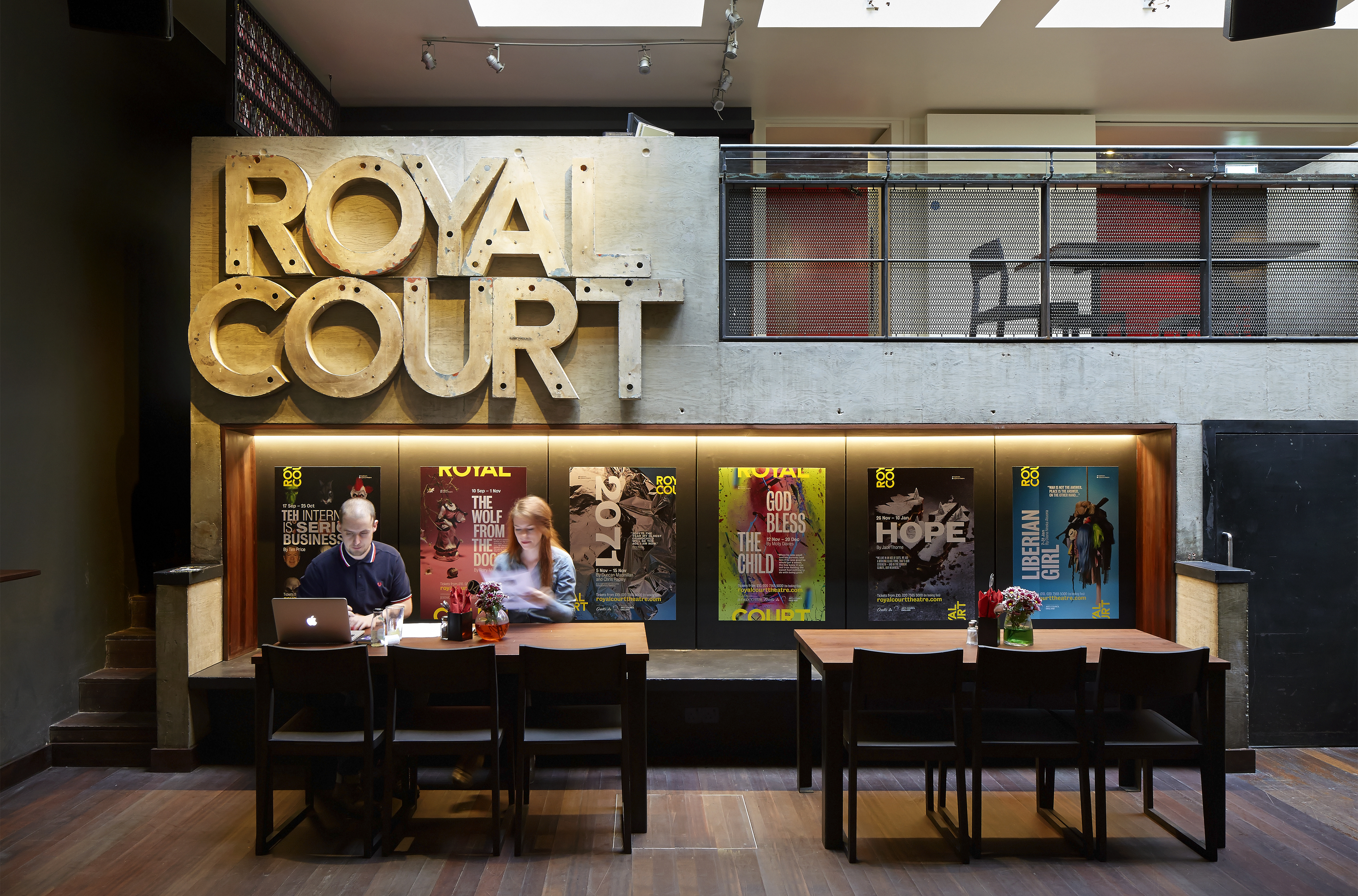 Royal Court Theatre - view of dining area beneath the iconic 'Royal Court' sign