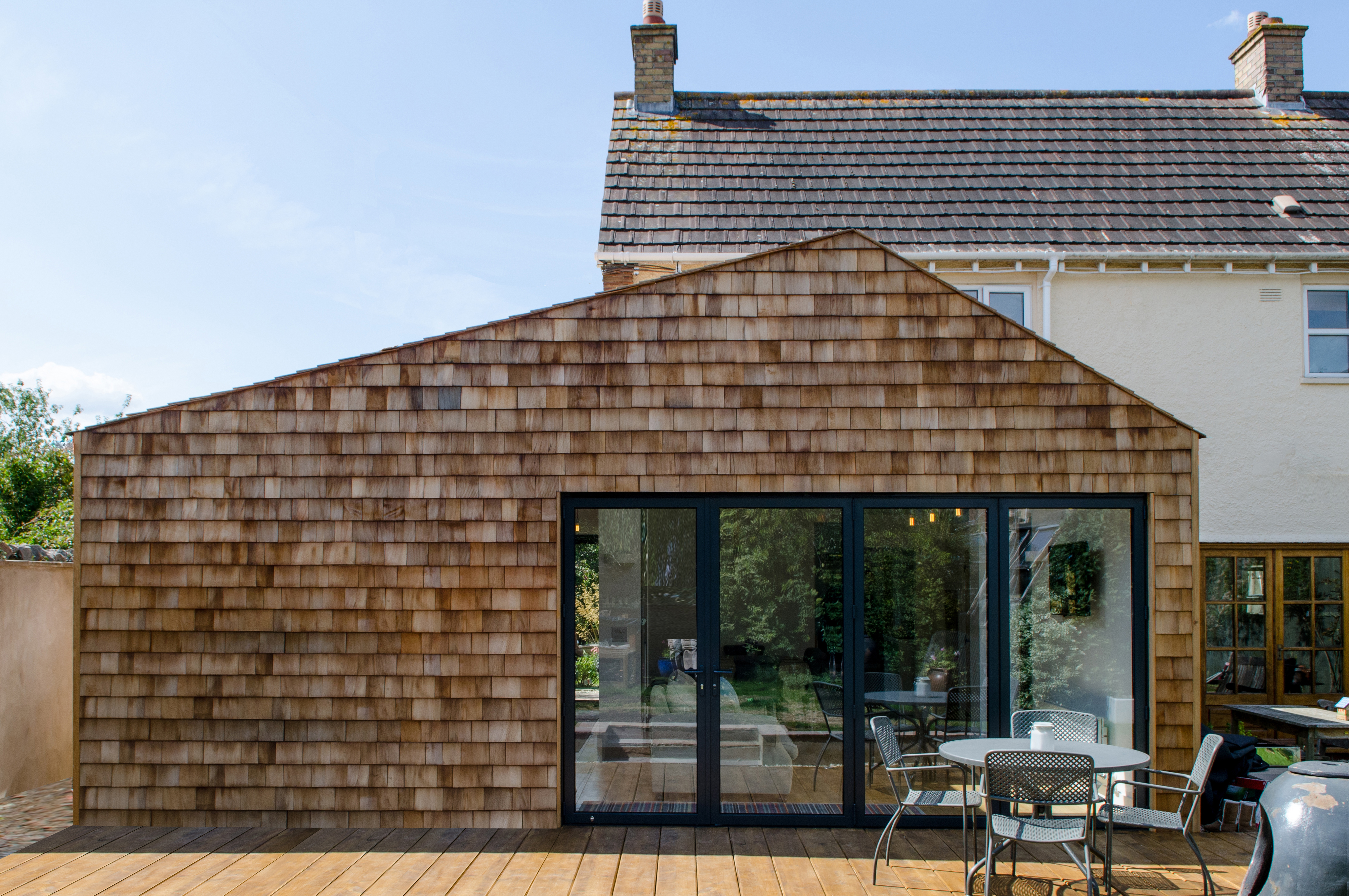The single-storey Cedar shingle extension is conceived in response to the existing house and the wider location of South Gloucestershire, taking influence in both form and material from the vernacular ways of building in its semi rural context.