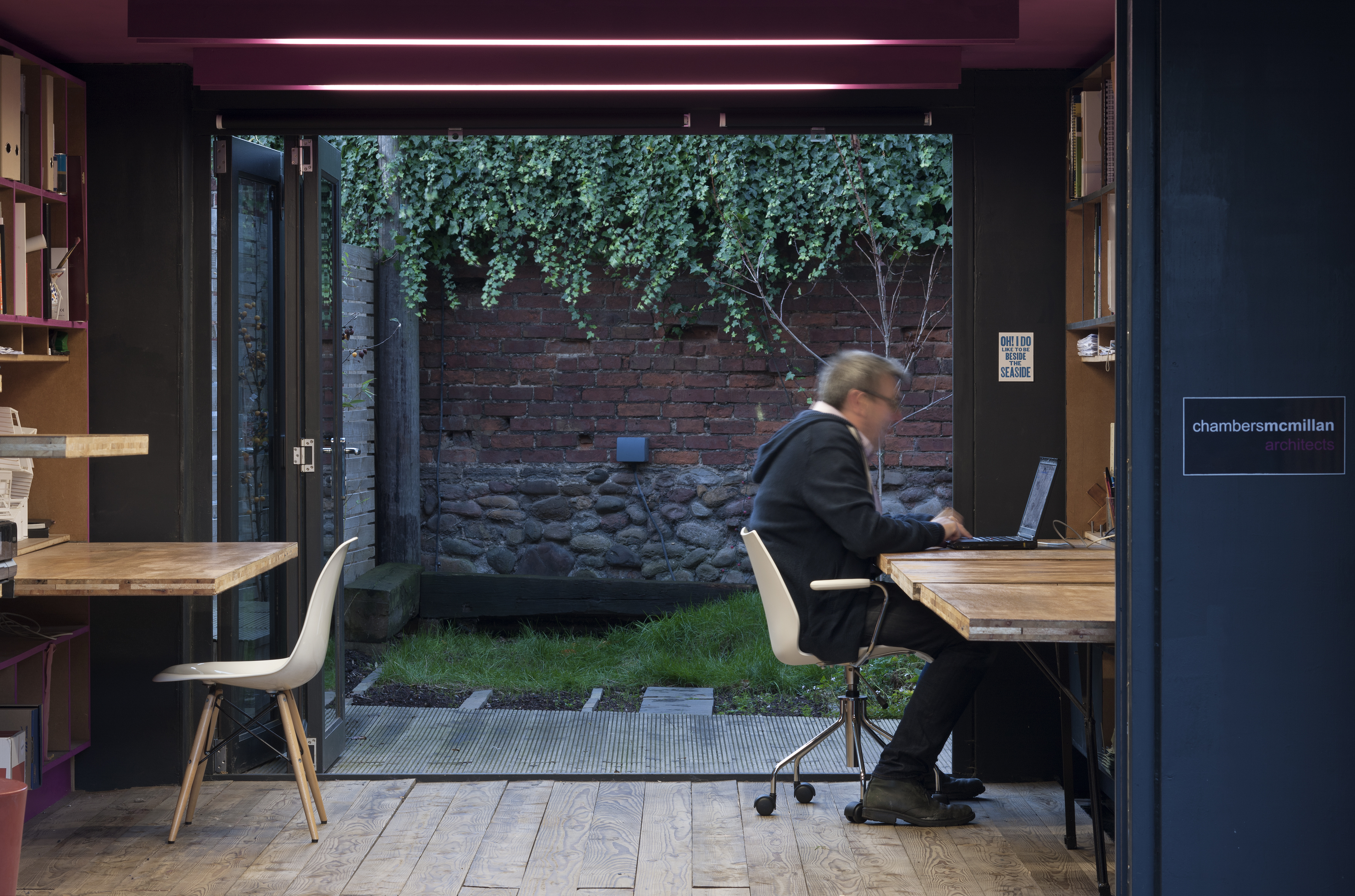 The front and back of the studio are glass folding doors, which allows connections between both the street and the back garden. When both are open, this brings a new semi public space to the studio's street presence and a more private outdoor space between home and work life.
