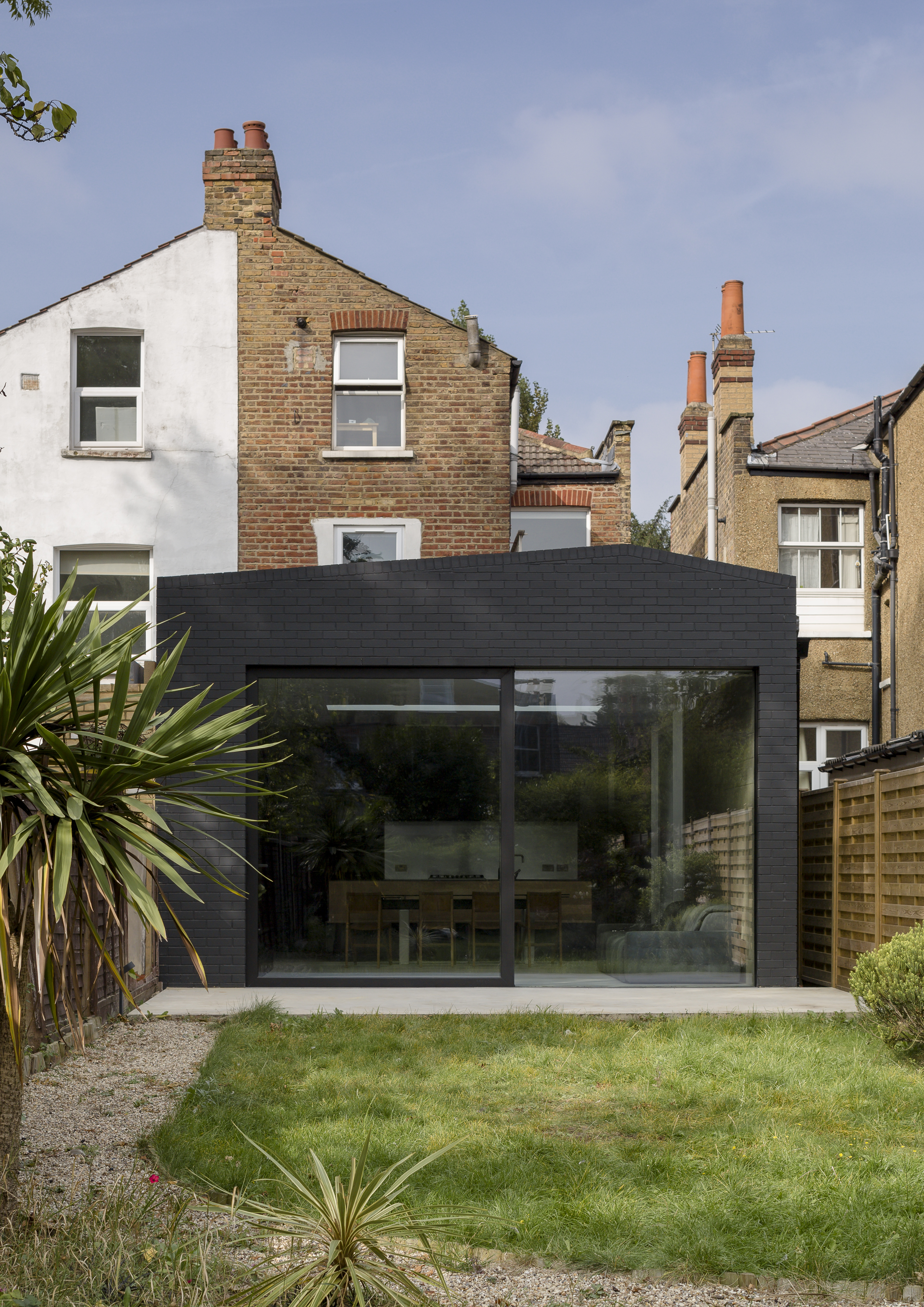 Externally, black paint conceals and unifies the use of low cost bricks with existing brickwork.