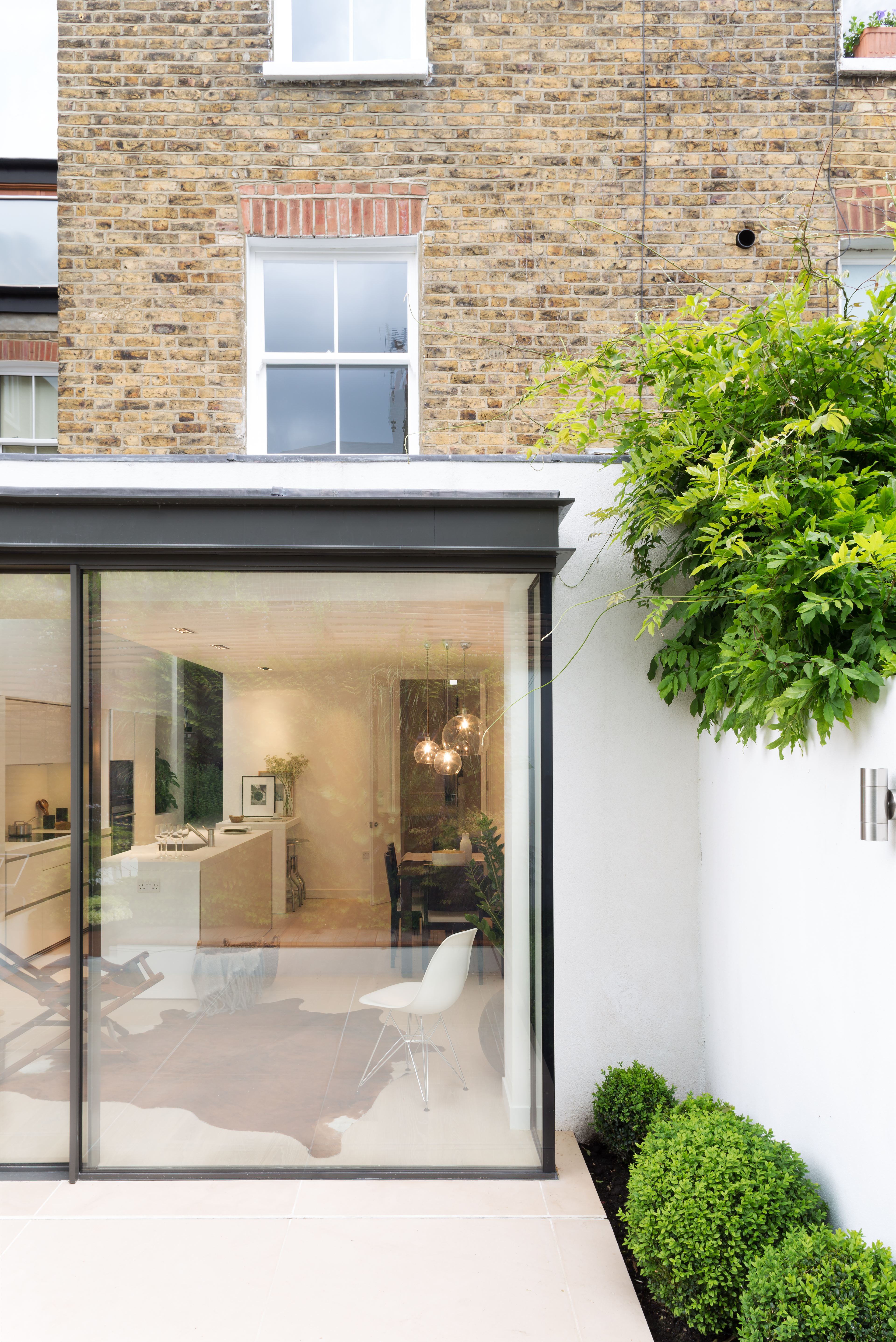 When re-modelling the house, the architect used the opportunity to showcase some of its design ideas, particularly the introduction of long views through the house and extensive use of glass both for the full width sliding rear doors and the frameless glass rooflight over the kitchen.