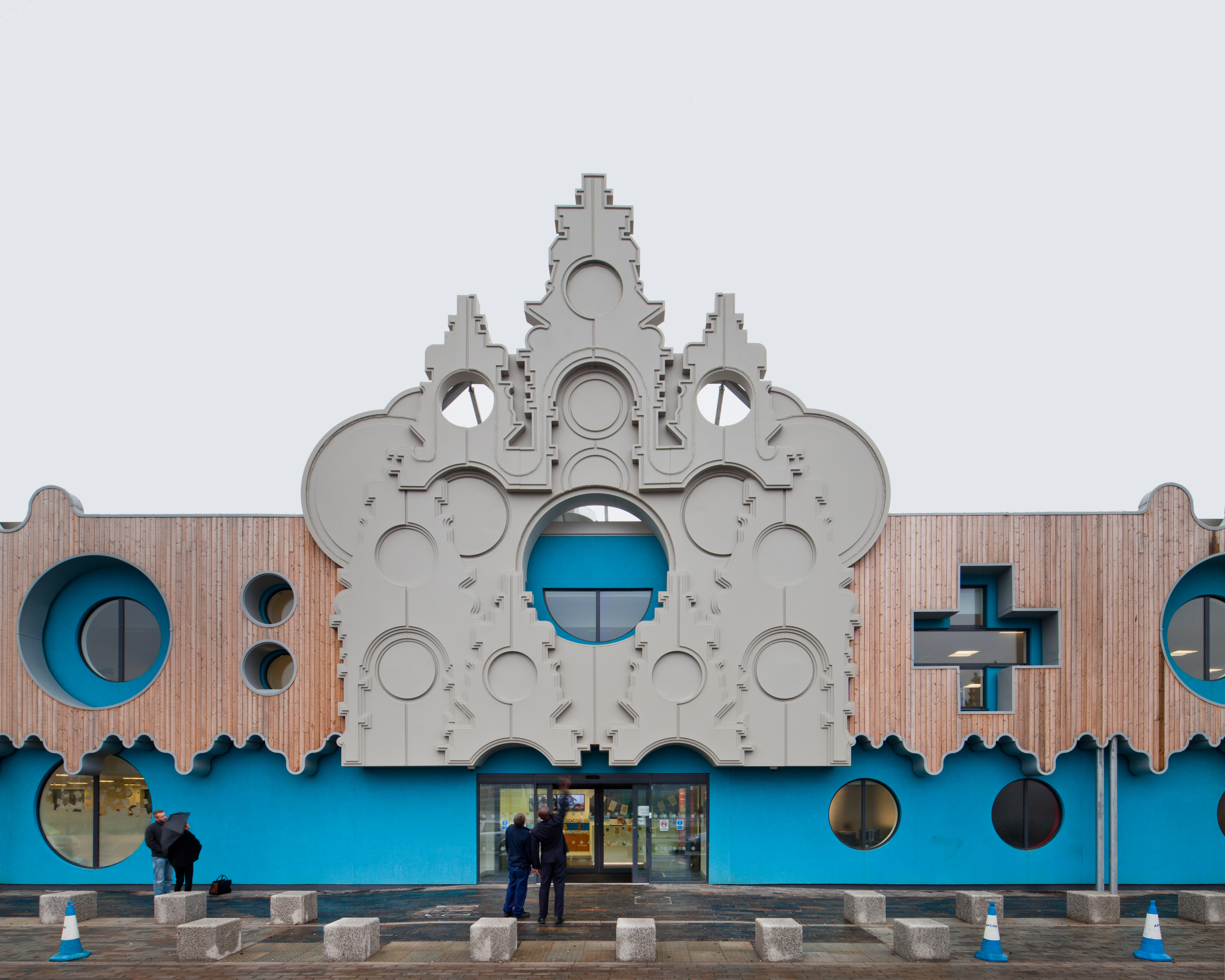 The façade, developed by FAT, uses motifs referencing the dock’s warehouses, wave forms and Cardiff’s gothic architecture.